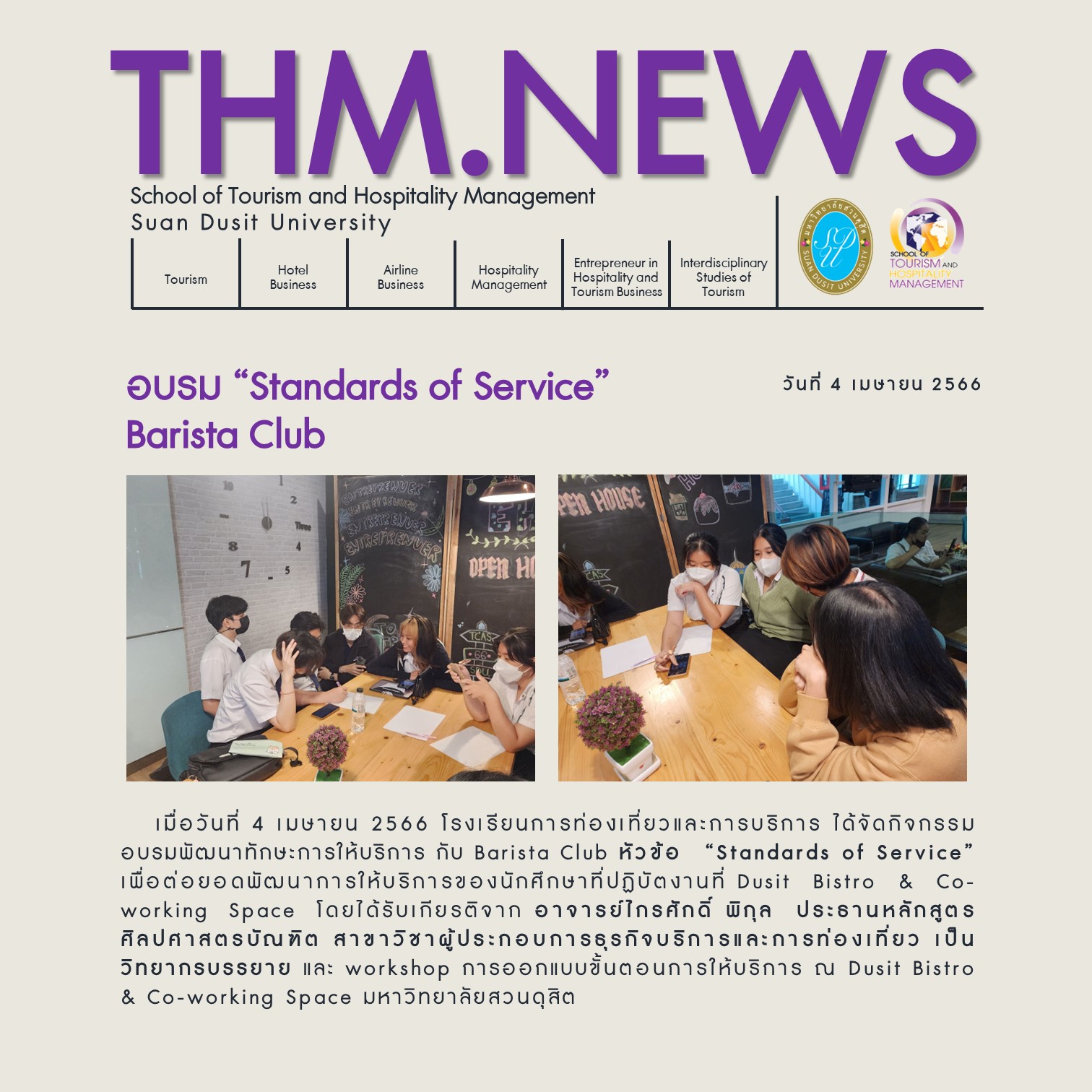เมื่อวันที่ 4 เมษายน 2566 โรงเรียนการท่องเที่ยวและการบริการ ได้จัดกิจกรรม อบรมพัฒนาทักษะการให้บริการ กับ Barista Club หัวข้อ “Standards of Service” เพื่อต่อยอดพัฒนาการให้บริการของนักศึกษาที่ปฏิบัตงานที่ Dusit Bistro & Co-working Space โดยได้รับเกียรติจาก อาจารย์ไกรศักดิ์ พิกุล ประธานหลักสูตรศิลปศาสตรบัณฑิต สาขาวิชาผู้ประกอบการธุรกิจบริการและการท่องเที่ยว เป็นวิทยากรบรรยาย และ workshop การออกแบบขั้นตอนการให้บริการ ณ Dusit Bistro & Co-working Space มหาวิทยาลัยสวนดุสิต