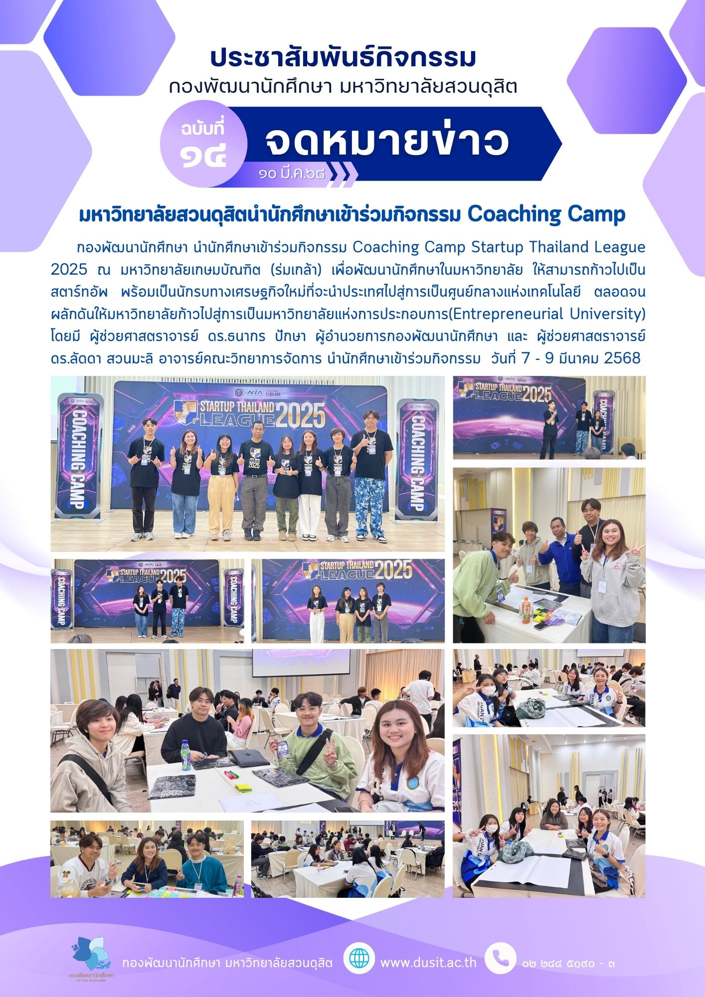 กองพัฒนานักศึกษา นำนักศึกษาเข้าร่วมกิจกรรม Coaching Camp Startup Thailand League 2025 ณ มหาวิทยาลัยเกษมบัณฑิต (ร่มเกล้า) เพื่อพัฒนานักศึกษาในมหาวิทยาลัย ให้สามารถก้าวไปเป็นสตาร์ทอัพ พร้อมเป็นนักรบทางเศรษฐกิจใหม่ที่จะนำประเทศไปสู่การเป็นศูนย์กลางแห่งเทคโนโลยี ตลอดจนผลักดันให้มหาวิทยาลัยก้าวไปสู่การเป็นมหาวิทยาลัยแห่งการประกอบการ(Entrepreneurial University) โดยมี ผู้ช่วยศาสตราจารย์ ดร.ธนากร ปักษา ผู้อำนวยการกองพัฒนานักศึกษา และ ผู้ช่วยศาสตราจารย์ ดร.ลัดดา สวนมะลิ อาจารย์คณะวิทยาการจัดการ นำนักศึกษาเข้าร่วมกิจกรรม วันที่ 7 - 9 มีนาคม 2568