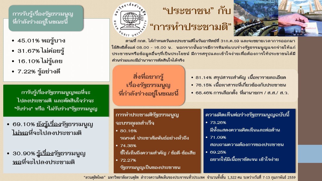 การสำรวจความคิดเห็นหัวข้อ “ประชาชนกับการทำประชามติ” โดยสวนดุสิตโพล มหาวิทยาลัยสวนดุสิต มีวัตถุประสงค์เพื่อศึกษาทัศนคติและความรู้ของประชาชนเกี่ยวกับการลงประชามติร่างรัฐธรรมนูญ พ.ศ. 2559 โดยเก็บข้อมูลจากกลุ่มตัวอย่างจำนวน 1,522 คน ระหว่างวันที่ 7–13 กุมภาพันธ์ 2559 ผลการสำรวจพบว่า ประชาชนส่วนใหญ่มีความรู้เกี่ยวกับร่างรัฐธรรมนูญในระดับ “พอรู้บ้าง” (45.01%) แต่ยังมีจำนวนมากที่ “ไม่ค่อยรู้” หรือ “ไม่รู้เลย” โดยสิ่งที่ประชาชนต้องการทราบมากที่สุดคือ สาระสำคัญของรัฐธรรมนูญ สิทธิและเสรีภาพ รวมถึงกระบวนการสรรหาตำแหน่งทางการเมือง ประชาชนร้อยละ 69.10 ระบุว่ายังมีความรู้ไม่เพียงพอที่จะตัดสินใจลงประชามติได้อย่างมั่นใจ ทั้งนี้ ข้อเสนอเพื่อให้การทำประชามติประสบความสำเร็จ ได้แก่ การรณรงค์ประชาสัมพันธ์อย่างทั่วถึง และการให้ข้อมูลที่ถูกต้อง ไม่บิดเบือน ผลสำรวจสะท้อนว่าประชาชนต้องการให้รัฐธรรมนูญมีเนื้อหาชัดเจน เข้าใจง่าย และเหมาะสมกับบริบทของประเทศ รวมถึงเปิดโอกาสให้ประชาชนมีส่วนร่วมตามระบอบประชาธิปไตยอย่างแท้จริง