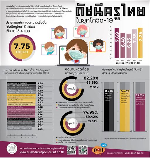การสำรวจความคิดเห็นของประชาชนจำนวน 3,734 คนทั่วประเทศในปี 2564 พบว่า ครูไทยได้รับคะแนนความเชื่อมั่นเฉลี่ย 7.75 เต็ม 10 โดยมีจุดแข็งด้าน Soft Skills เช่น มนุษยสัมพันธ์ดี มีจิตเมตตา บุคลิกภาพเหมาะสม รักในวิชาชีพ และความซื่อสัตย์สุจริต ขณะที่ด้านที่ยังต้องพัฒนาคือ การบริหารภาระงานที่มากเกินไป ขาดการสนับสนุนจากหน่วยงาน และปัญหาด้านรายได้ ภายใต้บริบทของสถานการณ์โควิด-19 ครูต้องปรับตัวอย่างเร่งด่วนในการสอนออนไลน์และการเรียนรู้แบบผสมผสาน เปลี่ยนบทบาทจากผู้ถ่ายทอดความรู้เป็นผู้ออกแบบกิจกรรมเพื่อกระตุ้นการเรียนรู้ที่เหมาะสมกับยุคดิจิทัล ประชาชนเห็นว่าครูควรพัฒนาเทคนิคการสอนให้ดึงดูด ใช้สื่อโซเชียลให้เกิดประโยชน์ และดูแลสุขภาพของตนเองมากขึ้น การเปลี่ยนผ่านครั้งนี้ถือเป็นโอกาสสำคัญในการยกระดับระบบการศึกษาไทย โดยไม่ปล่อยให้ครูหรือนักเรียนต้องหลุดออกจากระบบการศึกษา