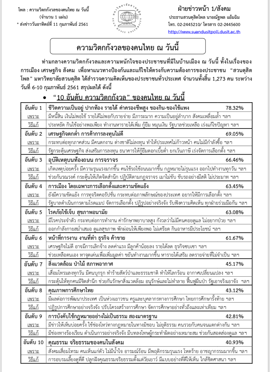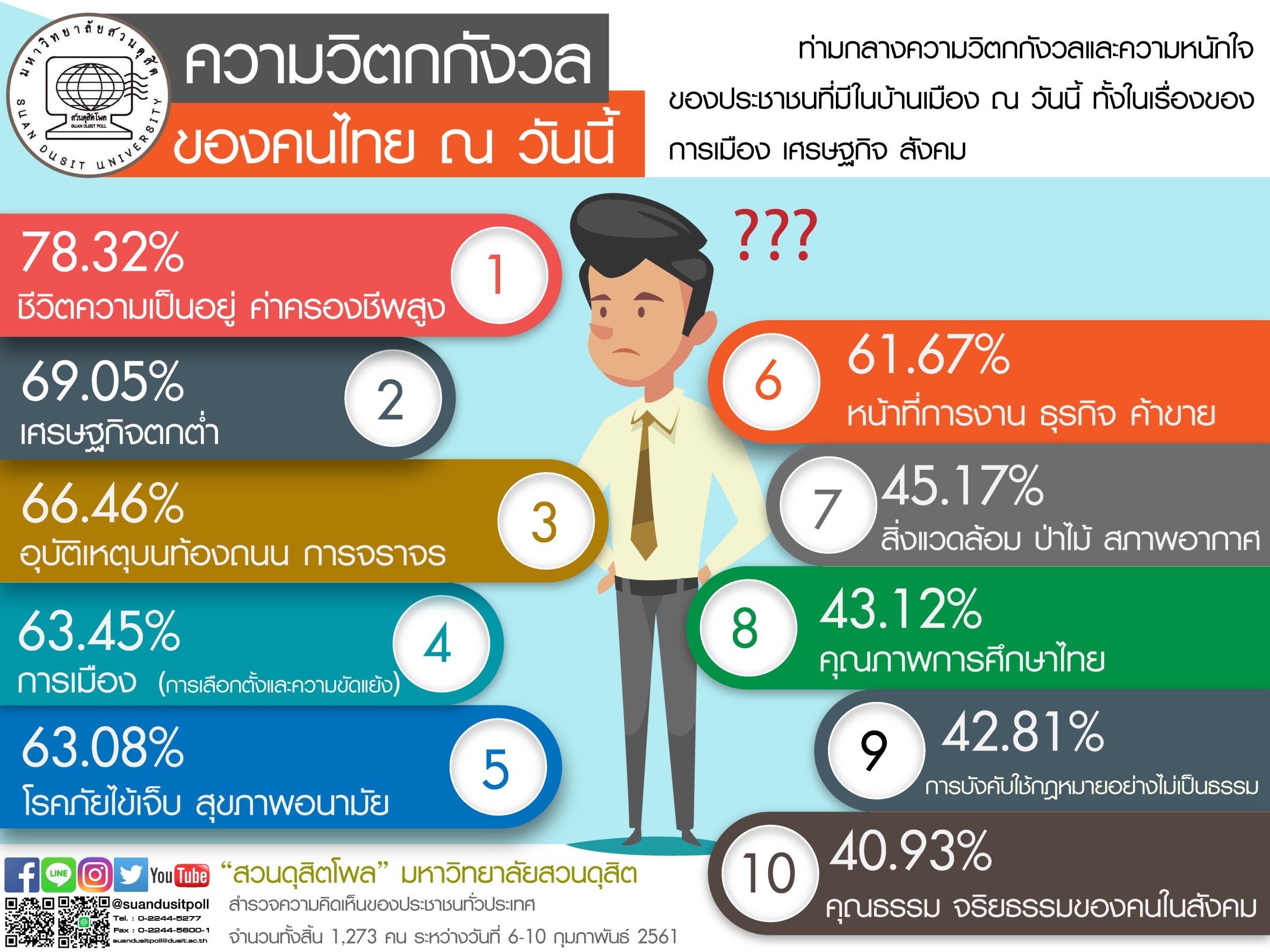 การสำรวจความคิดเห็นของประชาชนทั่วประเทศ จำนวน 1,273 คน ระหว่างวันที่ 6-10 กุมภาพันธ์ 2561 โดยสวนดุสิตโพล เกี่ยวกับความวิตกกังวลของคนไทย พบว่า อันดับ 1 คือ ชีวิตความเป็นอยู่ ปากท้อง รายได้ ค่าครองชีพสูง (78.32%) รองลงมาคือ เศรษฐกิจตกต่ำ การค้าการลงทุนไม่ดี (69.05%) อุบัติเหตุบนท้องถนน การจราจร (66.46%) การเมืองโดยเฉพาะการเลือกตั้งและความขัดแย้ง (63.45%) และโรคภัยไข้เจ็บ สุขภาพอนามัย (63.08%) ตามลำดับ นอกจากนี้ยังมีความกังวลเรื่องหน้าที่การงาน สิ่งแวดล้อม คุณภาพการศึกษา การบังคับใช้กฎหมาย และคุณธรรมจริยธรรมในสังคม โดยแต่ละประเด็นมีการเสนอแนะวิธีแก้ไขปัญหาที่เน้นการมีส่วนร่วมของประชาชน และการดำเนินงานอย่างจริงจังของหน่วยงานที่เกี่ยวข้อง