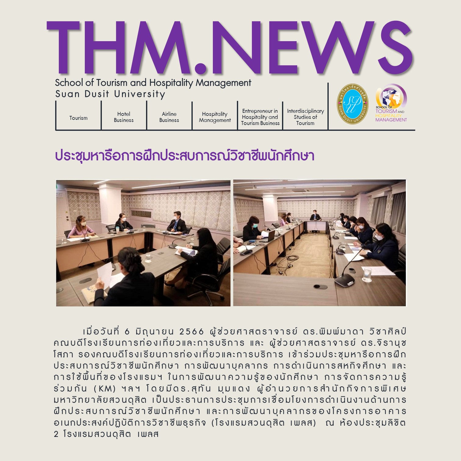 เมื่อวันที่ 6 มิถุนายน 2566 ผู้ช่วยศาสตราจารย์ ดร.พิมพ์มาดา วิชาศิลป์ คณบดีโรงเรียนการท่องเที่ยวและการบริการ และผู้ช่วยศษสตราจารย์ ดร.จิรานุช โสภา รองคณบดีโรงเรียนการท่องเที่ยวและการบริการ เข้าร่วมประชุมหารือการฝึกประสบการณ์วิชาชีพนักศึกษา การพัฒนาบุคลากร การดำเนินการสหกิจศึกษา และการใช้พื้นที่โรงแรมฯ ในการพัฒนาความรู้ของนักศึกษา การจัดการความรู้ร่วมกัน (KM) ฯลฯ โดยมีดร.สุทัน มุมแดง ผู้อำนวยการสำนักกิจการพิเศษ มหาวิทยาลัยสวนดุสิต เป็นประธานการประชุมการเชื่อมโยงการดำเนินการพิเศษฝึกประสบการณ์วิชาชีพนักศึกษา และการพัฒนาบุคลากรของโครงการอาคารอเนกประสงค์ปฏิบัติการวิชาชีพธุรกิจ (โรงแรมสวนดุสิต เพลส) ณ ห้องประชุมลิขิต 2 โรงแรมสวนดุสิต เพลส