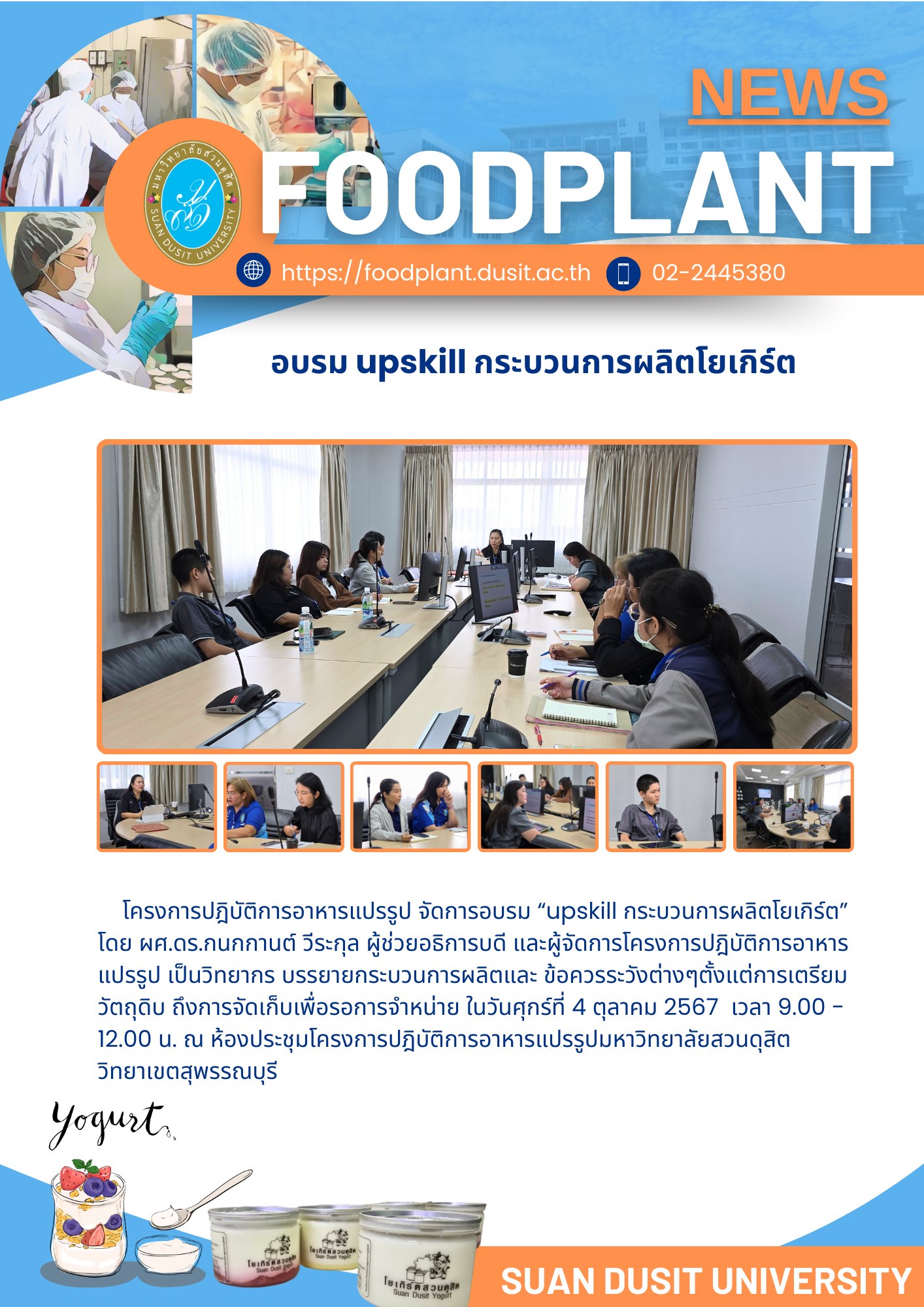 โครงการปฎิบัติการอาหารแปรรูป จัดการอบรม “upskill กระบวนการผลิตโยเกิร์ต” โดย ผศ.ดร.กนกกานต์ วีระกุล ผู้ช่วยอธิการบดี และผู้จัดการโครงการปฎิบัติการอาหารแปรรูป เป็นวิทยากร บรรยายกระบวนการผลิตและ ข้อควรระวังต่างๆตั้งแต่การเตรียมวัตถุดิบ ถึงการจัดเก็บเพื่อรอการจำหน่าย ในวันศุกร์ที่ 4 ตุลาคม 2567 เวลา 9.00 - 12.00 น. ณ ห้องประชุมโครงการปฎิบัติการอาหารแปรรูปมหาวิทยาลัยสวนดุสิต วิทยาเขตสุพรรณบุรี