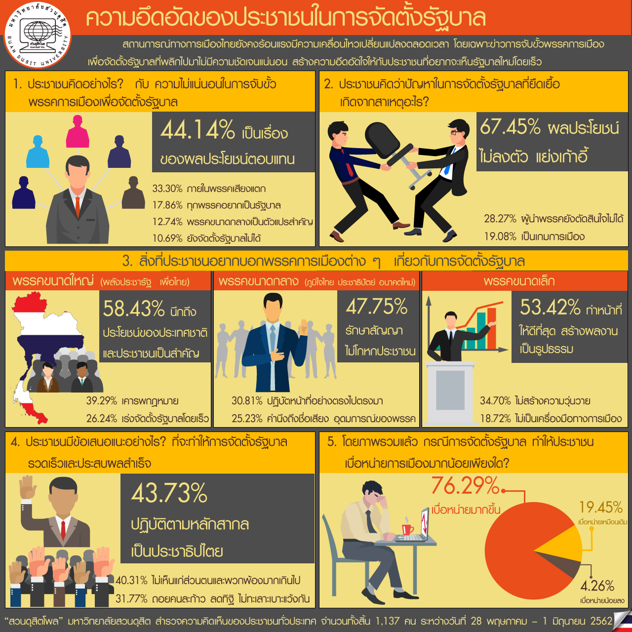 สวนดุสิตโพล มหาวิทยาลัยสวนดุสิต ได้สำรวจความคิดเห็นของประชาชนจำนวน 1,137 คน ระหว่างวันที่ 28 พฤษภาคม – 1 มิถุนายน 2562 เพื่อสะท้อนความรู้สึกของประชาชนต่อกระบวนการจัดตั้งรัฐบาลหลังการเลือกตั้ง ซึ่งยังเต็มไปด้วยความไม่แน่นอน โดย 44.14% ของประชาชนเห็นว่าสาเหตุสำคัญของความล่าช้าคือเรื่องผลประโยชน์และข้อเสนอระหว่างพรรคการเมือง ขณะที่ 67.45% ระบุว่าผลประโยชน์ไม่ลงตัวและการแย่งชิงตำแหน่งคือปัญหาหลัก ประชาชนร้อยละ 58.43 ต้องการให้ทุกพรรคคำนึงถึงประโยชน์ของประเทศชาติและหยุดเห็นแก่ตัว ส่วนข้อเสนอแนะในการจัดตั้งรัฐบาลให้ประสบผลสำเร็จ ได้แก่ การเคารพเสียงส่วนใหญ่ ปฏิบัติตามหลักประชาธิปไตย (43.73%) และลดการต่อรองเพื่อผลประโยชน์ส่วนตน (40.31%) โดยภาพรวม ร้อยละ 76.29 เบื่อหน่ายกับสถานการณ์การเมืองที่เต็มไปด้วยความขัดแย้งและไร้เสถียรภาพ แม้ผ่านการเลือกตั้งแล้วแต่กลับไม่สามารถจัดตั้งรัฐบาลได้ในเวลาที่เหมาะสม