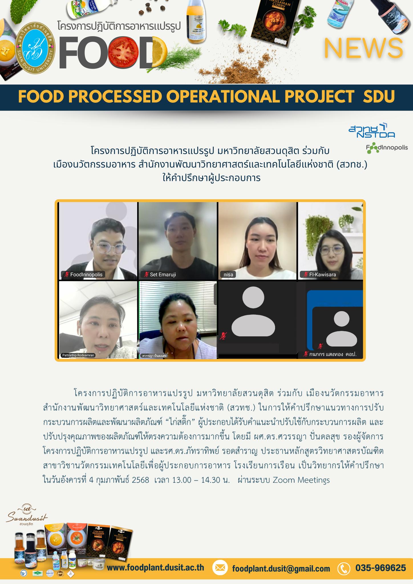 โครงการปฏิบัติการอาหารแปรรูป มหาวิทยาลัยสวนดุสิต ร่วมกับ เมืองนวัตกรรมอาหาร สำนักงานพัฒนาวิทยาศาสตร์และเทคโนโลยีแห่งชาติ (สวทช.) ในการให้คำปรึกษาแนวทางการปรับกระบวนการผลิตและพัฒนาผลิตภัณฑ์ “ไก่สติ๊ก” ผู้ประกอบได้รับคำแนะนำปรับใช้กับกระบวนการผลิต และปรับปรุงคุณภาพของผลิตภัณฑ์ให้ตรงความต้องการมากขึ้น โดยมี ผศ.ดร.ศวรรญา ปั่นดลสุข รองผู้จัดการโครงการปฏิบัติการอาหารแปรรูป และรศ.ดร.ภัทราทิพย์ รอดสำราญ ประธานหลักสูตรวิทยาศาสตรบัณฑิต สาขาวิชานวัตกรรมเทคโนโลยีเพื่อผู้ประกอบการอาหาร โรงเรียนการเรือน เป็นวิทยากรให้คำปรึกษา ในวันอังคารที่ 4 กุมภาพันธ์ 2568 เวลา 13.00 – 14.30 น. ผ่านระบบ Zoom Meetings