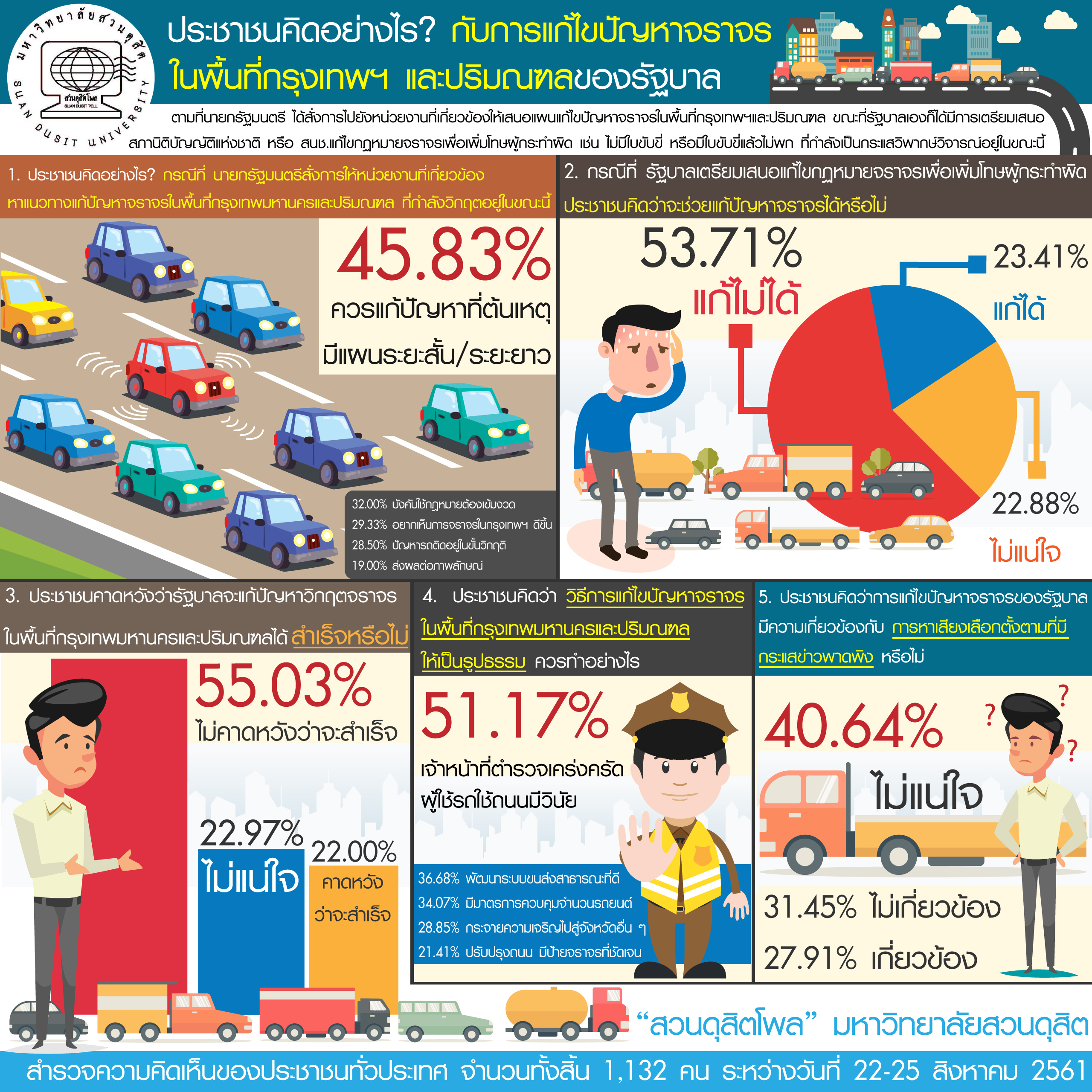 จากสถานการณ์ปัญหาการจราจรในพื้นที่กรุงเทพมหานครและปริมณฑลที่ทวีความรุนแรง “สวนดุสิตโพล” ได้สำรวจความคิดเห็นของประชาชนจำนวน 1,132 คน ระหว่างวันที่ 22–25 สิงหาคม 2561 เพื่อประเมินความเห็นต่อการสั่งการของนายกรัฐมนตรีในการแก้ไขปัญหาดังกล่าว พบว่า ประชาชนส่วนใหญ่เห็นด้วยกับการเร่งหามาตรการแก้ปัญหา แต่มีเพียง 22% ที่คาดหวังว่ารัฐบาลจะแก้ปัญหาได้สำเร็จ ขณะที่ 55.03% ไม่คาดหวัง เนื่องจากปัญหานี้เรื้อรังและซับซ้อน ประชาชนเชื่อว่าสาเหตุหลักของปัญหาคือจำนวนรถที่มากเกินไป การขาดวินัยในการใช้ถนน และระบบขนส่งสาธารณะที่ไม่เพียงพอ สำหรับมาตรการแก้ไข ควรเน้นที่การบังคับใช้กฎหมายอย่างเคร่งครัด การพัฒนาระบบขนส่งมวลชน และการควบคุมจำนวนรถยนต์ รวมถึงการกระจายความเจริญออกสู่ภูมิภาค เพื่อลดความหนาแน่นในเมือง ขณะที่บางส่วนเชื่อว่าการแก้ปัญหานี้อาจเกี่ยวข้องกับการหาเสียงก่อนการเลือกตั้ง แต่ก็ยังต้องรอดูผลลัพธ์จากการดำเนินงานของรัฐบาลในระยะต่อไป