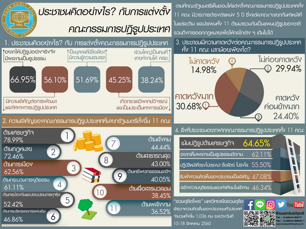 การสำรวจความคิดเห็นของประชาชนต่อการแต่งตั้งคณะกรรมการปฏิรูปประเทศ ที่ดำเนินการโดยสวนดุสิตโพล ระหว่างวันที่ 15-18 สิงหาคม 2560 กับกลุ่มตัวอย่าง 1,036 คน เพื่อสะท้อนความคิดเห็นต่อการแต่งตั้งคณะกรรมการปฏิรูปประเทศทั้ง 11 คณะ ที่มีวาระการดำรงตำแหน่ง 5 ปี