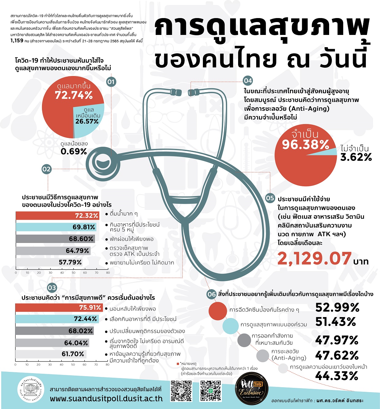 ผลกระทบจากสถานการณ์โควิด-19 ทำให้คนไทยหันมาใส่ใจสุขภาพตนเองมากขึ้น โดยร้อยละ 72.74 ระบุว่าดูแลสุขภาพมากขึ้น วิธีที่ใช้ได้แก่ การดื่มน้ำมาก กินอาหารครบหมู่ และพักผ่อนให้เพียงพอ ประชาชนเห็นว่าการมีสุขภาพดีควรเริ่มต้นจากการนอนหลับให้พอ เลือกอาหารที่ดี และการดูแลสุขภาพจิต ทั้งนี้ ในบริบทของการเข้าสู่สังคมผู้สูงอายุ ประชาชนถึงร้อยละ 96.38 เห็นว่าการดูแลเพื่อชะลอวัย (Anti-Aging) เป็นสิ่งจำเป็น ค่าใช้จ่ายเฉลี่ยต่อเดือนเพื่อดูแลสุขภาพอยู่ที่ 2,129.07 บาท ด้านความรู้ที่ประชาชนต้องการเพิ่มเติมคือ การฉีดวัคซีน การดูแลสุขภาพแบบองค์รวม และการออกกำลังกายที่เหมาะกับวัย นอกจากนี้ เวทีเสวนาในประเด็น “Care Economy” ชี้ว่าการดูแลสุขภาพต้องครอบคลุมทั้ง 4 มิติ คือ การพักผ่อน อาหาร สุขภาพจิต และการออกกำลังกาย พร้อมเน้นการใช้เทคโนโลยีการแพทย์สมัยใหม่อย่าง Precision Medicine เพื่อดูแลเฉพาะบุคคล ภาครัฐจึงควรส่งเสริมการลงทุนด้านเศรษฐกิจสุขภาพควบคู่กับคุณภาพชีวิตของประชาชนอย่างเป็นระบบ