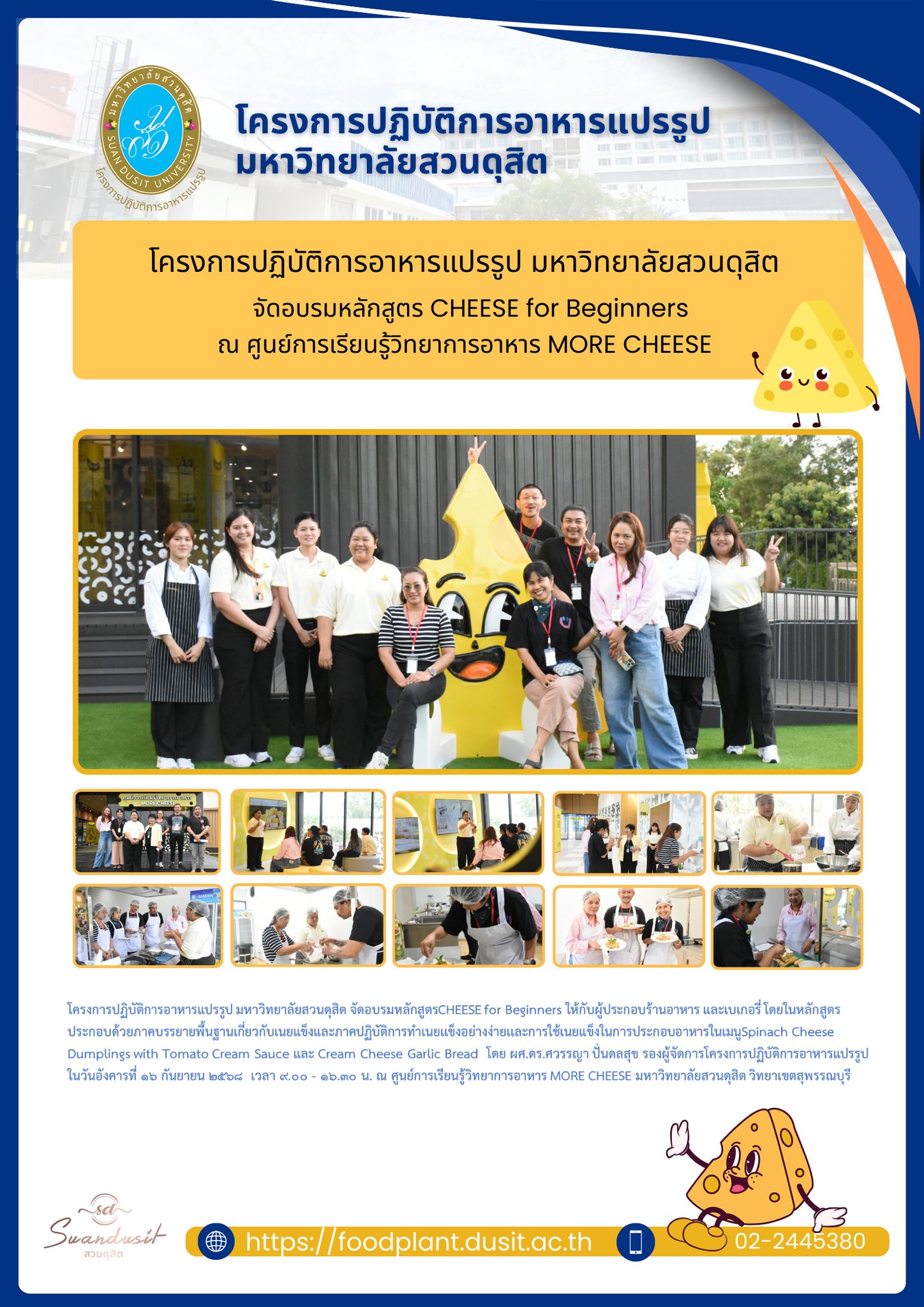 | dc.description.abstract | โครงการปฏิบัติการอาหารแปรรูป มหาวิทยาลัยสวนดุสิต จัดอบรมหลักสูตร CHEESE for Beginners ณ ศูนย์การเรียนรู้วิทยาการอาหาร MORE CHEESE ในวันอังคารที่ ๑๖ กันยายน ๒๕๖๘ เวลา ๙.๐๐ - ๑๖.๓๐ น. ณ ศูนย์การเรียนรู้วิทยาการอาหาร MORE CHEESE มหาวิทยาลัยสวนดุสิต วิทยาเขตสุพรรณบุรี | |
