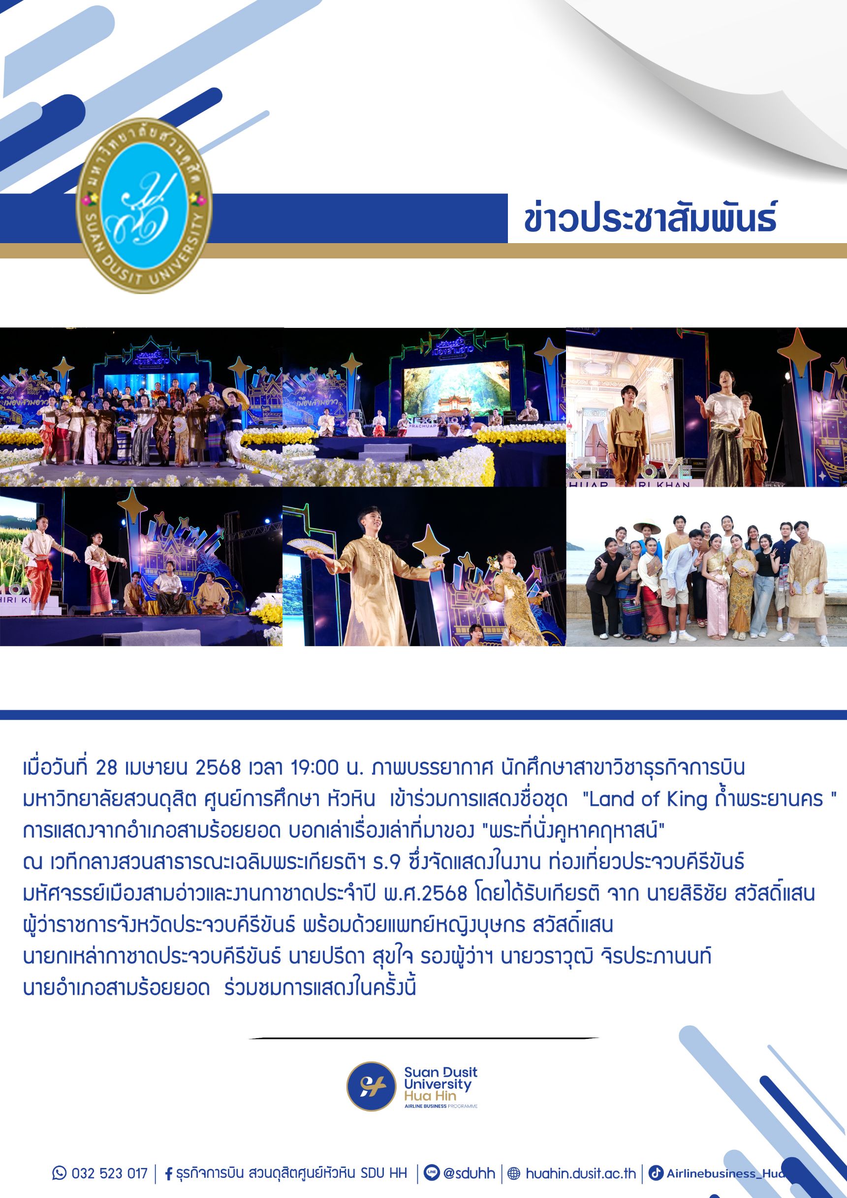 เมื่อวันที่ 28 เมษายน 2568 เวลา 19:00 น. ภาพบรรยากาศ นักศึกษาสาขาวิชาธุรกิจการบิน มหาวิทยาลัยสวนดุสิต ศูนย์การศึกษา หัวหิน เข้าร่วมการแสดงชื่อชุด "Land of King ถ้ำพระยานคร " การแสดงจากอำเภอสามร้อยยอด บอกเล่าเรื่องเล่าที่มาของ "พระที่นั่งคูหาคฤหาสน์" ณ เวทีกลางสวนสาธารณะเฉลิมพระเกียรติฯ ร.9 ซึ่งจัดแสดงในงาน ท่องเที่ยวประจวบคีรีขันธ์ มหัศจรรย์เมืองสามอ่าวและงานกาชาดประจำปี พ.ศ.2568 โดยได้รับเกียรติ จาก นายสิธิชัย สวัสดิ์แสน ผู้ว่าราชการจังหวัดประจวบคีรีขันธ์ พร้อมด้วยแพทย์หญิงบุษกร สวัสดิ์แสน นายกเหล่ากาชาดประจวบคีรีขันธ์ นายปรีดา สุขใจ รองผู้ว่าฯ นายวราวุฒิ จิรประภานนท์ นายอำเภอสามร้อยยอด ร่วมชมการแสดงในครั้งนี้