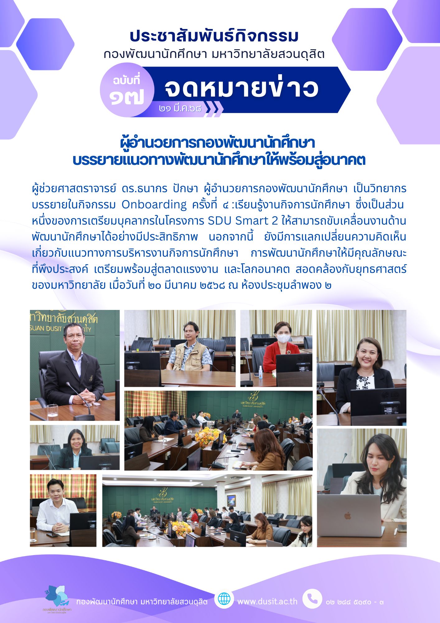 ผู้ช่วยศาสตราจารย์ ดร.ธนากร ปักษา ผู้อำนวยการกองพัฒนานักศึกษา เป็นวิทยากรบรรยายในกิจกรรม Onboarding ครั้งที่ ๔ :เรียนรู้งานกิจการนักศึกษา ซึ่งเป็นส่วนหนึ่งของการเตรียมบุคลากรในโครงการ SDU Smart 2 ให้สามารถขับเคลื่อนงานด้านพัฒนานักศึกษาได้อย่างมีประสิทธิภาพ นอกจากนี้ ยังมีการแลกเปลี่ยนความคิดเห็น เกี่ยวกับแนวทางการบริหารงานกิจการนักศึกษา การพัฒนานักศึกษาให้มีคุณลักษณะ ที่พึงประสงค์ เตรียมพร้อมสู่ตลาดแรงงาน และโลกอนาคต สอดคล้องกับยุทธศาสตร์ของมหาวิทยาลัย เมื่อวันที่ ๒๐ มีนาคม ๒๕๖๘ ณ ห้องประชุมลำพอง ๒