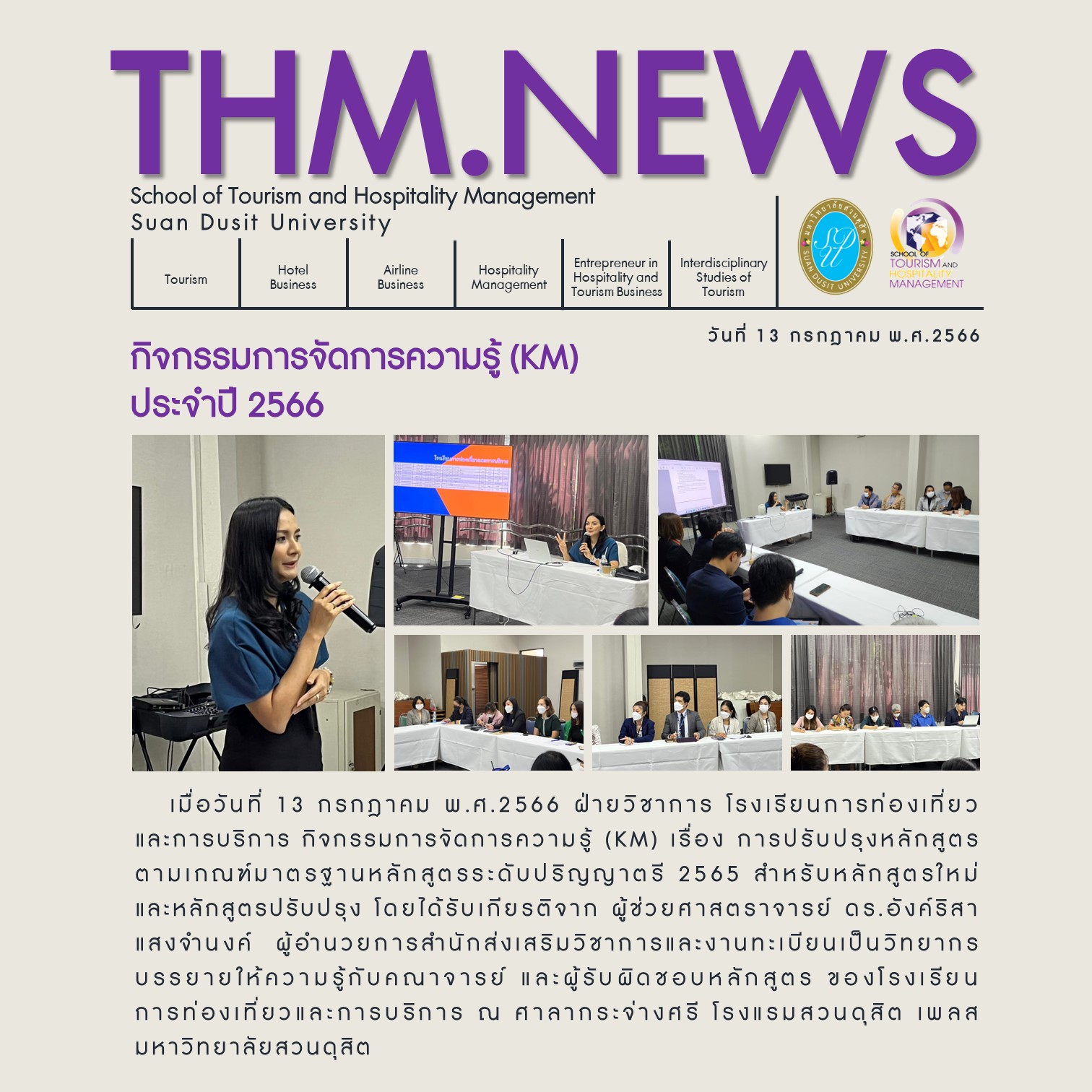 เมื่อวันที่ 13 กรกฎาคม 2566 ฝ่ายวิชาการ โรงเรียนการท่องเที่ยวและการบริการ กิจกรรมการจัดการความรู้ (KM) ประจำปีการศึกษา 2565 สำหรับหลักสูตรใหม่และหลักสูตรปรับปรุง โดยได้รับเกียรติจาก ผู้ช่วยศาสตราจารย์ ดร.อังค์ริสา แสงจำนงค์ ผู้อำนวยการสำนักส่งเสริมวิชาการและงานทะเบียนเป็นวิทยากรบรรยายให้ความรู้กับคณาจารย์ และผู้รับผิดชอบหลักสูตรของโรงเรียนการท่องเที่ยวและการบริการ ณ ศาลากระจ่างศรี โรงแรมสวนดุสิต เพลส มหาวิทยาลัยวนดุสิต