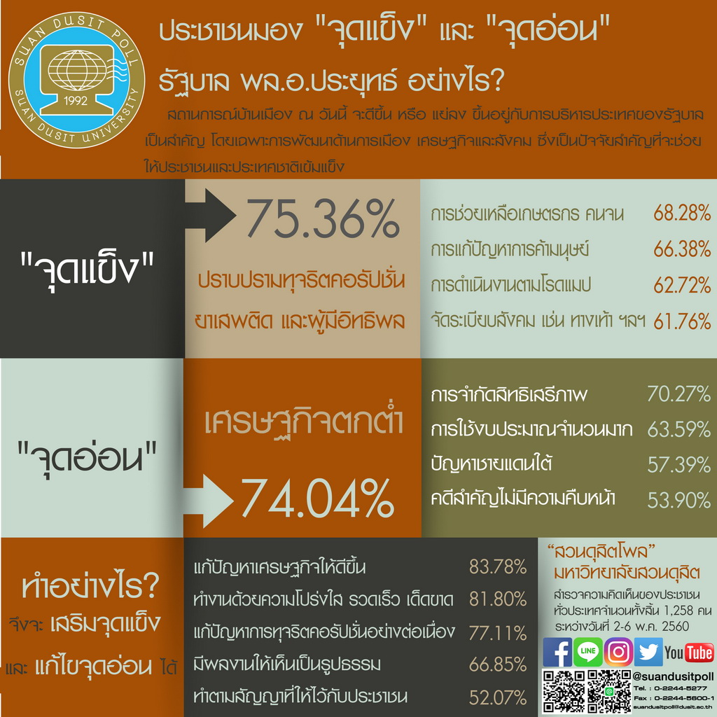 การศึกษาครั้งนี้ส่ารวจความคิดเห็นของประชาชนทั่วประเทศจำนวน 1,258 คน ระหว่างวันที่ 2-6 พฤษภาคม 2560 เกี่ยวกับการประเมินจุดแข็งและจุดอ่อนของรัฐบาลพล.อ.ประยุทธ์ในการบริหารประเทศ ผลการส่ารวจแสดงให้เห็นว่า ประชาชนมองว่าจุดแข็งของรัฐบาลที่สำคัญ 5 อันดับแรก ได้แก่ การปราบปรามทุจริตคอร์รัปชั่นยาเสพติดและผู้มีอิทธิพล (75.36%) การช่วยเหลือเกษตรกรคนจน (68.28%) การแก้ปัญหาการค้ามนุษย์ (66.38%) การดำเนินงานตามโรดแมป (62.72%) และการจัดระเบียบสังคม (61.76%) สำหรับจุดอ่อนที่สำคัญ คือ เศรษฐกิจตกต่ำ (74.04%) การจำกัดสิทธิเสรีภาพ (70.27%) การใช้งบประมาณจำนวนมากซื้อเรือดำน้ำ (63.59%) ปัญหาชายแดนใต้ (57.39%) และคดีสำคัญไม่มีความคืบหน้า (53.90%) ในการแก้ไขปัญหา ประชาชนต้องการให้รัฐบาลแก้ปัญหาเศรษฐกิจ (83.78%) ทำงานอย่างโปร่งใส (81.80%) และแก้ปัญหาการทุจริตอย่างต่อเนื่อง (77.11%)