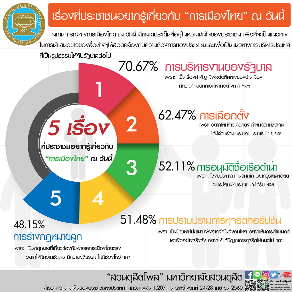การศึกษาครั้งนี้ส่ารวจความคิดเห็นของประชาชนทั่วประเทศจำนวน 1,207 คน ระหว่างวันที่ 24-28 เมษายน 2560 เกี่ยวกับประเด็นทางการเมืองไทยที่ประชาชนให้ความสนใจและต้องการทราบข้อมูล เพื่อเป็นแนวทางในการนำเสนอข่าวของสื่อมวลชนและเป็นแนวทางการบริหารประเทศที่เป็นรูปธรรมให้กับรัฐบาลต่อไป ผลการส่ารวจแสดงให้เห็นว่า ประชาชนให้ความสนใจเรื่องการบริหารงานของรัฐบาลมากที่สุด (70.67%) เนื่องจากมีผลต่อทิศทางของบ้านเมืองและต้องการให้แก้ปัญหาเศรษฐกิจ รองลงมาคือการเลือกตั้ง (62.47%) การอนุมัติซื้อเรือดำน้ำ (52.11%) การปราบปรามการทุจริตคอร์รัปชั่น (51.48%) และการร่างกฎหมายลูก (48.15%) ตามลำดับ การศึกษานี้สะท้อนให้เห็นถึงความต้องการของประชาชนในการรับรู้ข้อมูลข่าวสารเกี่ยวกับการเมืองไทยและการบริหารประเทศในปัจจุบัน