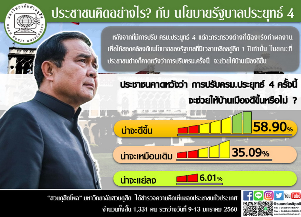 ภายหลังจากการปรับคณะรัฐมนตรีเป็น “ครม.ประยุทธ์ 4” เพื่อเตรียมเดินหน้าตามโรดแมปและแก้ปัญหาประเทศในช่วงเวลาที่เหลือเพียง 1 ปี “สวนดุสิตโพล” ได้สำรวจความคิดเห็นของประชาชนจำนวน 1,331 คน ระหว่างวันที่ 9–13 มกราคม 2560 เพื่อประเมินความรู้สึกและความคาดหวังของประชาชนต่อการปรับ ครม.ครั้งนี้ ผลสำรวจพบว่า “5 กระทรวง” ที่มีนโยบายถูกใจประชาชนมากที่สุด ได้แก่ กระทรวงคมนาคม (67.34%) ศึกษาธิการ (63.29%) พาณิชย์ (60.13%) เกษตรฯ (59.04%) และการต่างประเทศ (56.66%) โดยประชาชนกว่า 58.90% เชื่อว่าการปรับ ครม. ครั้งนี้จะช่วยให้บ้านเมืองดีขึ้น สิ่งที่ประชาชนต้องการฝากถึงรัฐบาล ได้แก่ การเร่งแก้ปัญหาเศรษฐกิจ ค่าครองชีพ และราคาสินค้า (74.15%) การพัฒนาประเทศอย่างยั่งยืน การช่วยเหลือเกษตรกร การปราบทุจริต และการบังคับใช้กฎหมายอย่างเคร่งครัด ซึ่งสะท้อนความคาดหวังที่สูงต่อการบริหารงานของรัฐบาลในช่วงสุดท้ายของวาระ