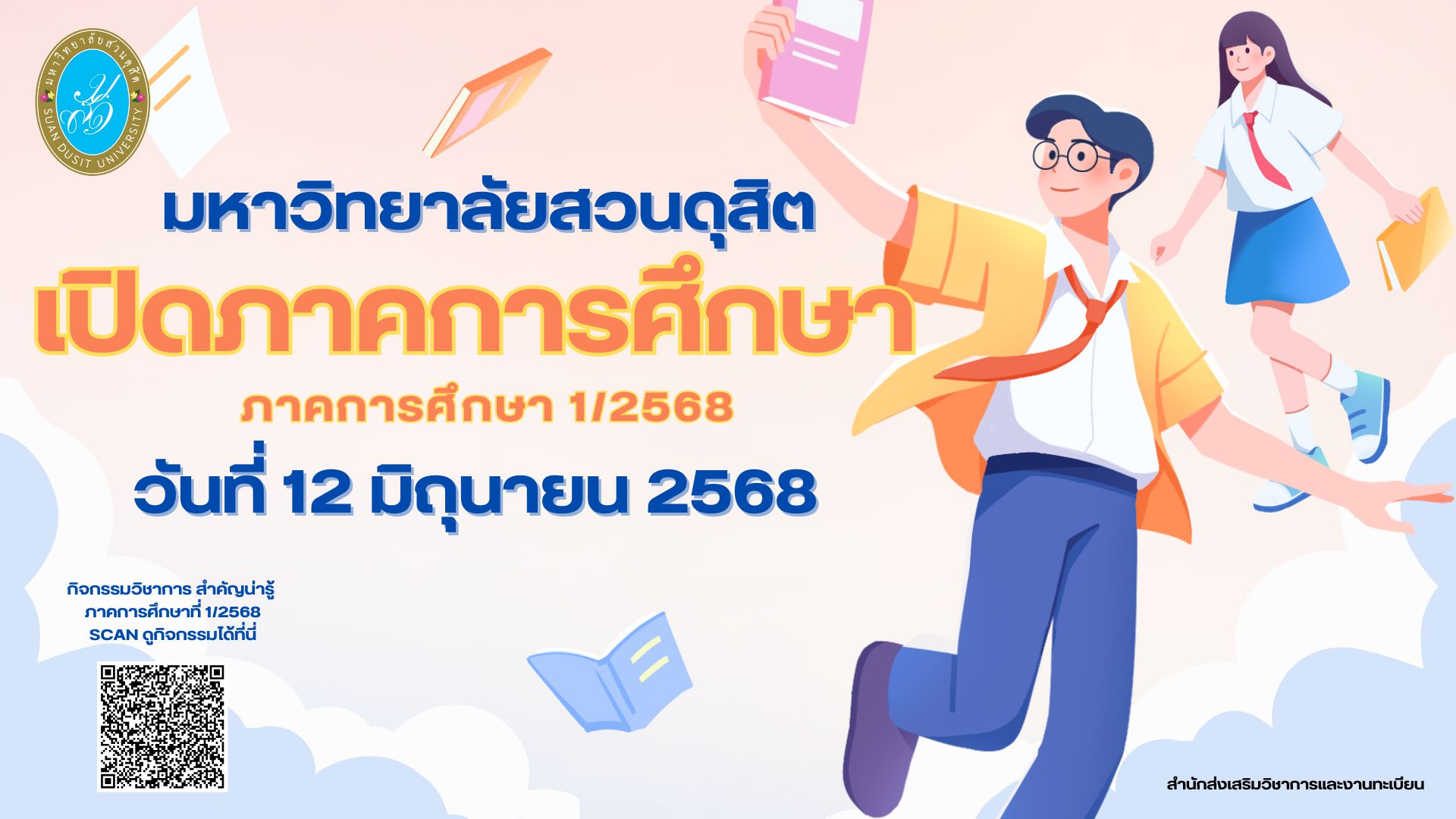 มหาวิทยาลัยสวนดุสิต ประกาศเปิดภาคการศึกษา 1/2568 ในวันที่ 12 มิถุนายน 2568 นักศึกษาสามารถเข้าร่วมกิจกรรมวิชาการที่สำคัญเพื่อเตรียมความพร้อมสำหรับปีการศึกษาใหม่ ดูรายละเอียดกิจกรรมเพิ่มเติมได้ผ่าน QR Code ที่แนบมา จัดโดยสำนักส่งเสริมวิชาการและงานทะเบียน