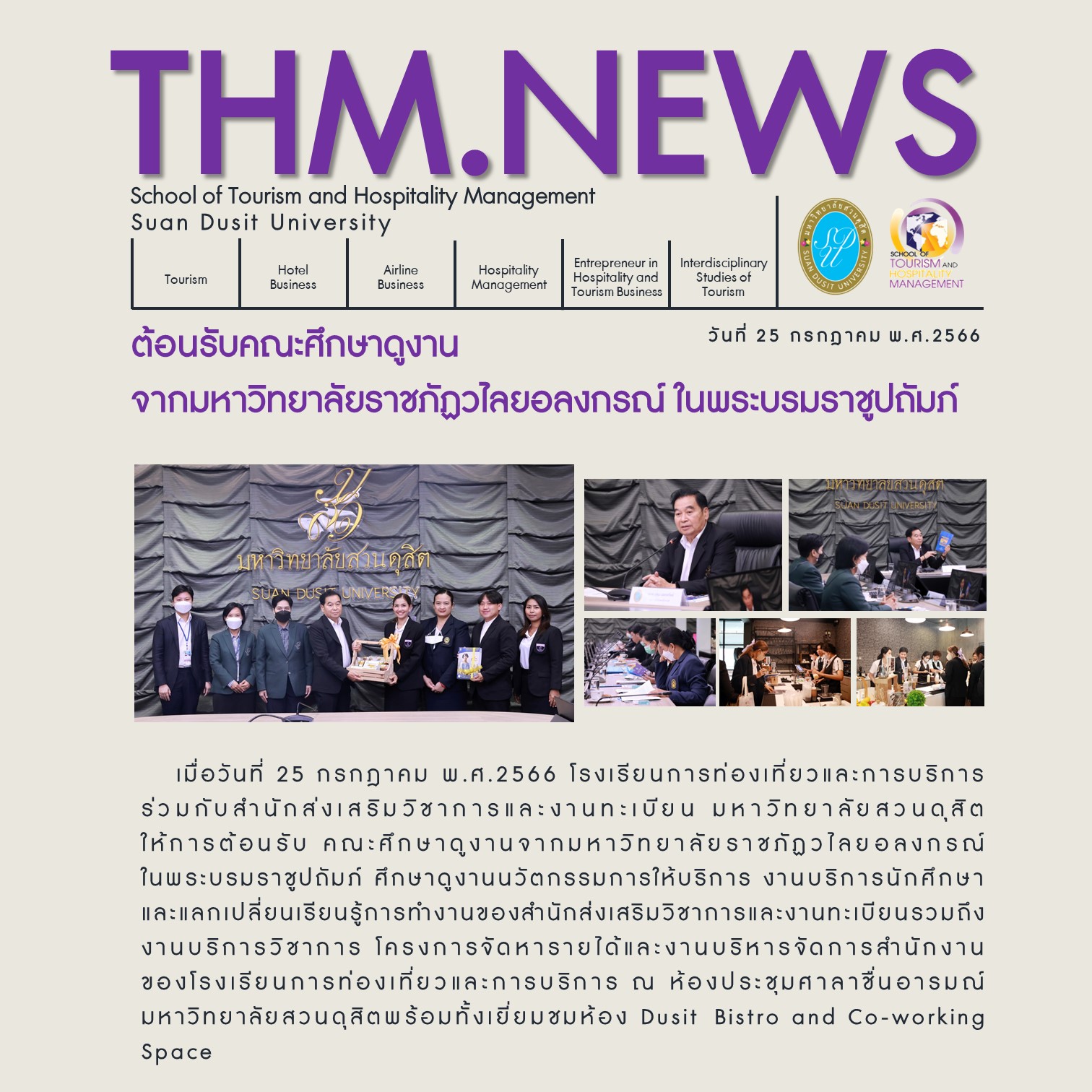 เมื่อวันที่ 25 กรกฎาคม พ.ศ.2566 โรงเรียนการท่องเที่ยวและการบริการ ร่วมกับสำนักส่งเสริมวิชาการและงานทะเบียน มหาวิทยาลัยสวนดุสิต ให้การต้อนรับ คณะศึกษาดูงานจากมหาวิทยาลัยราชภัฏวไลยอลงกรณ์ ในพระบรมราชูปถัมภ์ ศึกษาดูงานนวัตกรรมการให้บริการ งานบริการนักศึกษาและแลกเปลี่ยนเรียนรู้การทำงานของสำนักส่งเสริมวิชาการและงานทะเบียนรวมถึงงานบริการวิชาการ โครงการจัดหารายได้และงานบริหารจัดการสำนักงานของโรงเรียนการท่องเที่ยวและการบริการ ณ ห้องประชุมศาลาชื่นอารมณ์ มหาวิทยาลัยสวนดุสิตพร้อมทั้งเยี่ยมชมห้อง Dusit0Bistro and Co-working Space