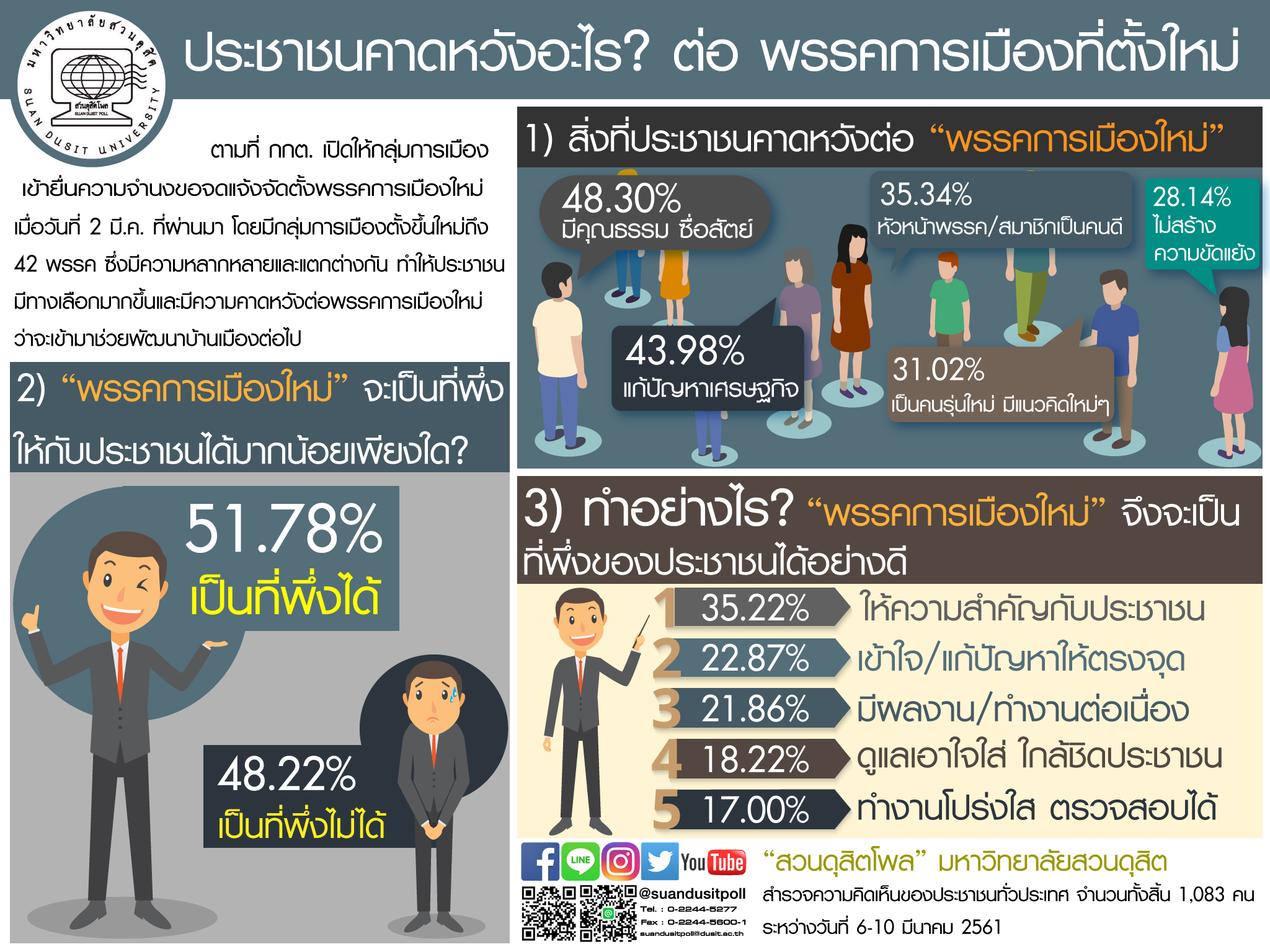 ผลสำรวจความคิดเห็นของประชาชน 1,083 คน เกี่ยวกับความคาดหวังต่อพรรคการเมืองที่ตั้งใหม่ จัดทำโดยมหาวิทยาลัยสวนดุสิต ระหว่างวันที่ 6-10 มีนาคม 2561 หลังจาก กกต. เปิดให้กลุ่มการเมืองยื่นจดแจ้งจัดตั้งพรรคใหม่เมื่อวันที่ 2 มีนาคม ซึ่งมีการจัดตั้งถึง 42 พรรค ผลสำรวจพบว่า ประชาชนคาดหวังให้พรรคการเมืองใหม่มีคุณธรรม ซื่อสัตย์ ไม่คดโกง (48.30%) สามารถแก้ปัญหาเศรษฐกิจ ทำเพื่อส่วนรวม และพัฒนาประเทศ (43.98%) มีหัวหน้าพรรคและสมาชิกที่เป็นคนดี คนเก่ง (35.34%) ประชาชนส่วนใหญ่ (51.78%) เชื่อว่าพรรคการเมืองใหม่จะเป็นที่พึ่งได้ เพราะเป็นผู้แทนของประชาชน มีศักยภาพและความสามารถในการทำงาน ขณะที่ 48.22% เห็นว่าเป็นที่พึ่งไม่ได้ เพราะเป็นคนหน้าเดิม กลุ่มเดิม เป็นนอมินี และเน้นประโยชน์ส่วนตน ประชาชนเสนอว่าพรรคการเมืองจะเป็นที่พึ่งได้ต้องให้ความสำคัญกับประชาชน รับฟังความเดือดร้อน และแก้ปัญหาให้ตรงจุด