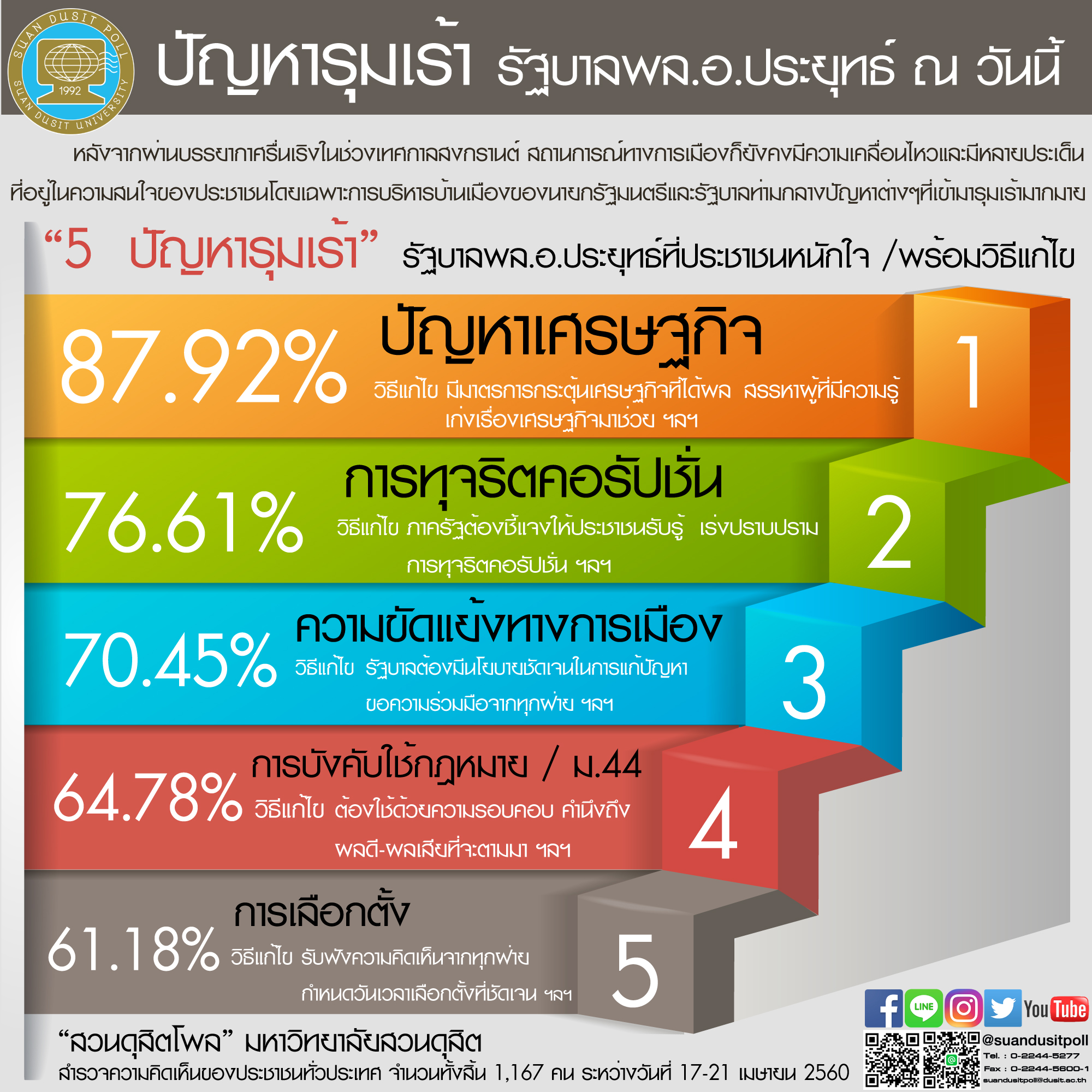 หลังผ่านช่วงเทศกาลสงกรานต์ปี 2560 สถานการณ์การเมืองไทยยังคงเต็มไปด้วยประเด็นที่ประชาชนให้ความสนใจ โดยเฉพาะการบริหารงานของรัฐบาลภายใต้การนำของ พล.อ.ประยุทธ์ จันทร์โอชา เพื่อสะท้อนความคิดเห็นของประชาชน “สวนดุสิตโพล” ได้สำรวจกลุ่มตัวอย่างทั่วประเทศจำนวน 1,167 คน ระหว่างวันที่ 17-21 เมษายน 2560 พบว่า ปัญหาอันดับหนึ่งที่ประชาชนหนักใจคือ “ปัญหาเศรษฐกิจ” ซึ่งยังไม่มีแนวทางแก้ไขที่เป็นรูปธรรม อันดับสองคือ “การทุจริตคอร์รัปชัน” โดยเห็นว่าขาดการตรวจสอบที่โปร่งใส ถัดมาคือ “ความขัดแย้งทางการเมือง” ที่ส่งผลต่อความมั่นคงของประเทศ อันดับสี่คือ “การบังคับใช้กฎหมายและมาตรา 44” ที่ถูกมองว่าเป็นการจำกัดเสรีภาพ และอันดับห้าคือ “การเลือกตั้ง” ที่กระบวนการยังไม่ชัดเจน ประชาชนเสนอแนวทางแก้ไขในแต่ละประเด็น เช่น การส่งเสริมความโปร่งใส การมีส่วนร่วมของทุกฝ่าย และการพัฒนานโยบายเศรษฐกิจอย่างยั่งยืน