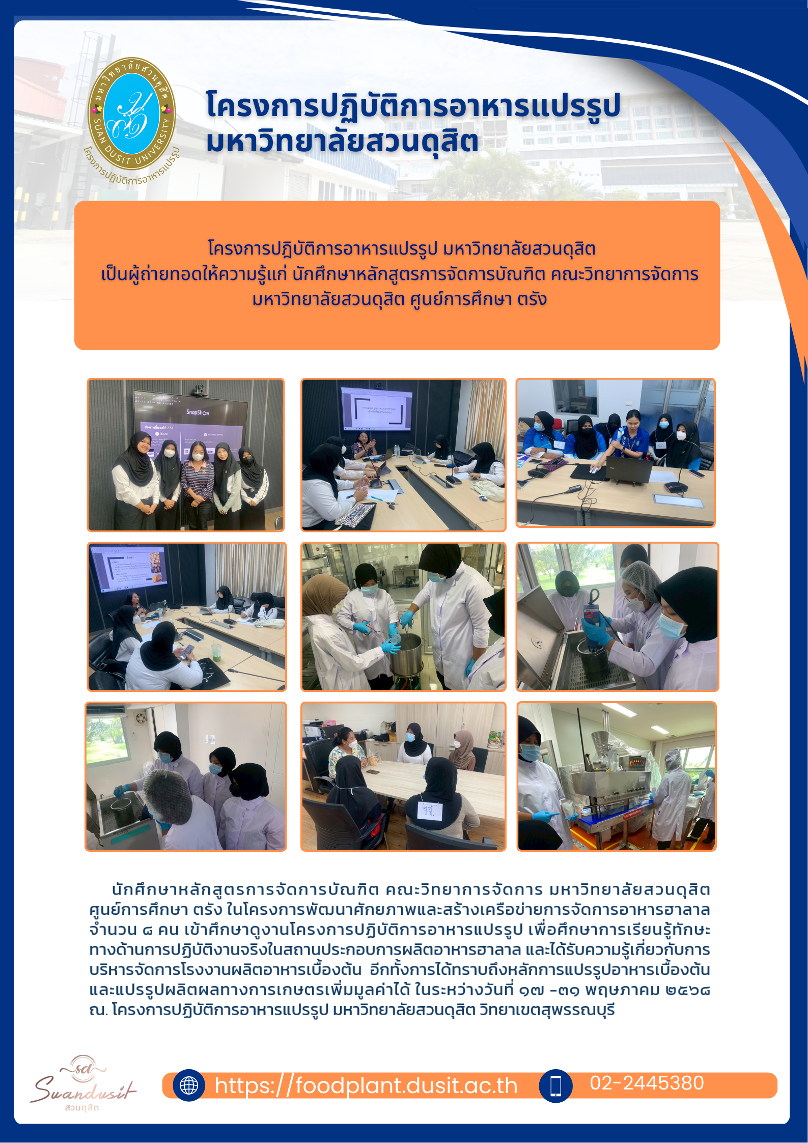 โครงการปฎิบัติการอาหารแปรรูป มหาวิทยาลัยสวนดุสิต ถ่ายทอดให้ความรู้แก่ นักศึกษาหลักสูตรการจัดการบัณฑิต คณะวิทยาการจัดการ มหาวิทยาลัยสวนดุสิต ศูนย์การศึกษา ตรัง ในระหว่างวันที่ ๑๗ -๓๑ พฤษภาคม ๒๕๖๘