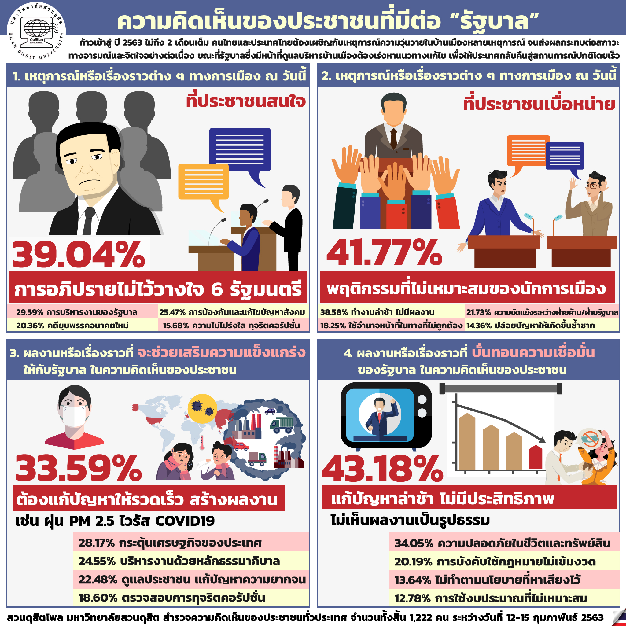 ในช่วงต้นปี 2563 ที่ประเทศไทยเผชิญเหตุการณ์สำคัญหลายด้าน ทั้งวิกฤตการณ์ไวรัสโคโรนา (COVID-19), ปัญหาฝุ่น PM2.5, เหตุกราดยิงในโคราช และปัญหาทางการเมือง สวนดุสิตโพล มหาวิทยาลัยสวนดุสิต ได้สำรวจความคิดเห็นของประชาชนจำนวน 1,222 คน ระหว่างวันที่ 12–15 กุมภาพันธ์ 2563 เกี่ยวกับการบริหารประเทศของรัฐบาล พบว่า ประชาชนสนใจประเด็นการอภิปรายไม่ไว้วางใจรัฐมนตรี (39.04%) และการบริหารงานของรัฐบาลในการแก้ปัญหาเศรษฐกิจ (29.59%) ในทางกลับกัน ประชาชนเบื่อหน่ายต่อพฤติกรรมไม่เหมาะสมของนักการเมือง เช่น การเสียบบัตรแทนกัน (41.77%) และการทำงานล่าช้า ไม่มีผลงานที่จับต้องได้ (38.58%) ทั้งนี้ ผลงานที่จะช่วยเสริมความเชื่อมั่นต่อรัฐบาล ได้แก่ การแก้ปัญหาอย่างรวดเร็ว โดยเฉพาะวิกฤตฝุ่นและไวรัส (33.59%) และการกระตุ้นเศรษฐกิจ (28.17%) ในขณะที่ปัจจัยบั่นทอนความเชื่อมั่น ได้แก่ การแก้ปัญหาล่าช้า และการบังคับใช้กฎหมายที่ไม่เป็นธรรม