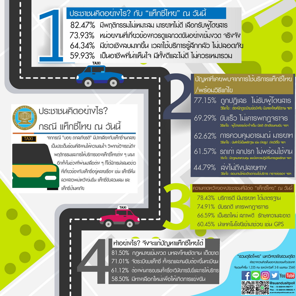 การสำรวจความคิดเห็นของประชาชนจำนวน 1,335 คน ระหว่างวันที่ 3-8 เมษายน 2560 เกี่ยวกับแท็กซี่ไทยในปัจจุบัน ภายหลังจากกรณี "บอย ถกลเกียรติ" ที่เกิดปากเสียงกับแท็กซี่ พบว่า ประชาชนส่วนใหญ่ (82.47%) มองว่าแท็กซี่ไทยมีพฤติกรรมไม่เหมาะสม มารยาทไม่ดี และเลือกรับผู้โดยสาร ตามด้วยการต้องการให้หน่วยงานที่เกี่ยวข้องดูแลกวดขันอย่างเข้มงวด (73.93%) ปัญหาที่ผู้ใช้บริการพบมากที่สุดคือ การถูกปฏิเสธไม่รับผู้โดยสาร (77.15%) และปัญหาการขับรถที่ไม่เคารพกฎจราจร (69.29%) ความคาดหวังของประชาชนต่อแท็กซี่ไทยสูงสุดคือ การบริการดีและมีมารยาท (78.43%) รองลงมาคือ การขับรถดีและเคารพกฎจราจร (74.91%) สำหรับการแก้ปัญหา ประชาชนต้องการให้มีกฎหมายเข้มงวดและบทลงโทษชัดเจน (81.50%) และการจัดระเบียบแท็กซี่ให้ขึ้นทะเบียนอย่างถูกต้อง (71.01%)