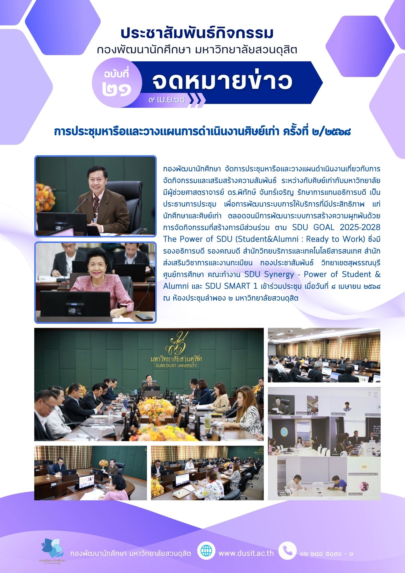 กองพัฒนานักศึกษา จัดประชุมหารือและวางแผนดำเนินงานเกี่ยวกับการจัดกิจกรรมและเสริมสร้างความสัมพันธ์ระหว่างกับศิษย์เก่ากับมหาวิทยาลัย โดยมีผู้ช่วยศาสตราจารย์ ดร.พิทักษ์ จันทร์เจริญ รักษาการแทนอธิการบดี เป็นประธานการประชุม เพื่อการพัฒนาระบบการให้บริการที่มีประสิทธิภาพแก่นักศึกษาและศิษย์เก่า ตลอดจนมีการพัฒนาระบบการสร้างความผูกพันด้วยการจัดกิจกรรมที่สร้างการมีส่วนร่วม ตาม SDU GOAL 2025 - 2028 The Power of SDU (Student & Alumni : Ready to Work) ซึ่งมีรองอธิการบดี รองคณบดี สำนักวิทยบริการและเทคโนโลยีสารสนเทศ สำนักส่งเสริมวิชาการและงานทะเบียน กองประชาสัมพันธ์ คณะทำงาน SDU Synergy - Power of Student & Alumni SDU SMART 1 ศูนย์การศึกษา และวิทยาเขตสุพรรณบุรี เข้าร่วมประชุม เมื่อวันที่ 8 เมษายน 2568 ณ ห้องประชุมลำพอง 2 มหาวิทยาลัยสวนดุสิต