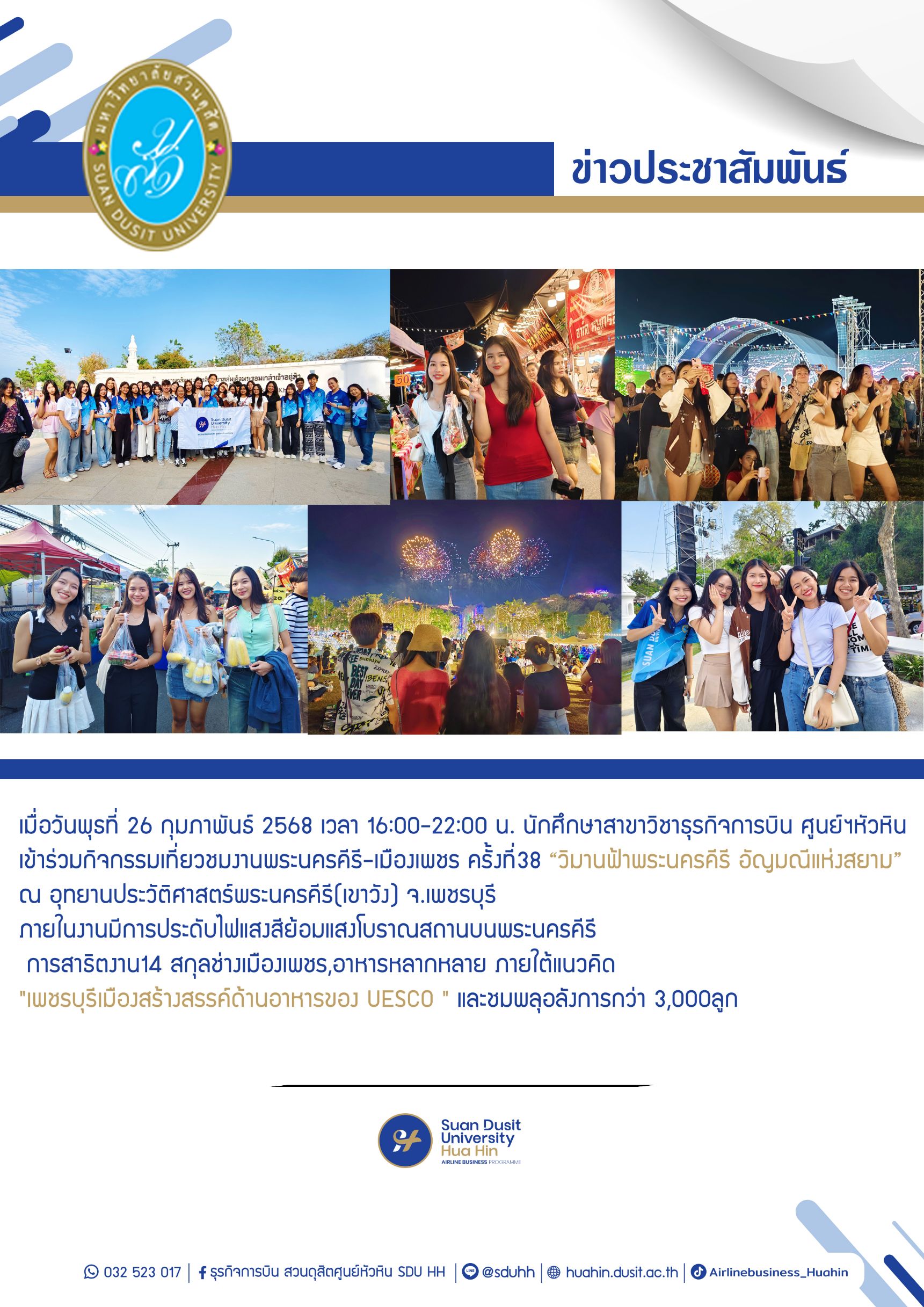 เมื่อวันพุธที่ 26 กุมภาพันธ์ 2568 เวลา 16:00-22:00 น. นักศึกษาสาขาวิชาธุรกิจการบิน ศูนย์การศึกษา หัวหิน เข้าร่วมกิจกรรมเที่ยวชมงานพระนครคีรี-เมืองเพชร ครั้งที่ 38 “วิมานฟ้าพระนครคีรี อัญมณีแห่งสยาม” ณ อุทยานประวัติศาสตร์พระนครคีรี (เขาวัง) จ.เพชรบุรี