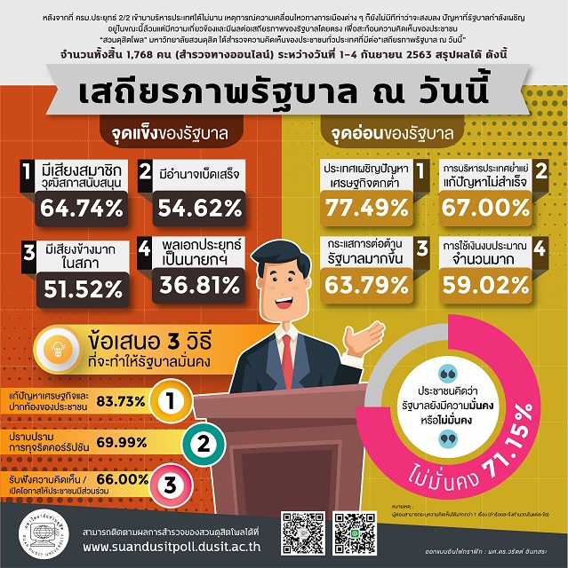 สวนดุสิตโพล มหาวิทยาลัยสวนดุสิต ได้ทำการสำรวจความคิดเห็นของประชาชนจำนวน 1,768 คน ระหว่างวันที่ 1–4 กันยายน 2563 เพื่อสะท้อนมุมมองต่อเสถียรภาพของรัฐบาล พล.อ.ประยุทธ์ จันทร์โอชา ในช่วงที่รัฐบาลประสบปัญหาทางเศรษฐกิจและแรงกดดันทางการเมือง ผลสำรวจพบว่า ร้อยละ 71.15 ของประชาชนมองว่ารัฐบาลอยู่ในภาวะไม่มั่นคง จุดแข็งหลักของรัฐบาลคือการได้รับเสียงสนับสนุนจาก ส.ว. และเสียงข้างมากในสภา ส่วนจุดอ่อนที่สำคัญ ได้แก่ ภาวะเศรษฐกิจตกต่ำ (77.49%) การบริหารประเทศล้มเหลว และกระแสต่อต้านที่เพิ่มขึ้น ประชาชนเสนอแนวทางเพื่อสร้างเสถียรภาพ ได้แก่ การแก้ปัญหาเศรษฐกิจ (83.73%) การปราบคอร์รัปชัน และการเปิดรับฟังความคิดเห็นของประชาชน ผลสำรวจสะท้อนว่าความมั่นคงของรัฐบาลขึ้นอยู่กับความสามารถในการจัดการปัญหาพื้นฐานของประชาชนเป็นหลัก