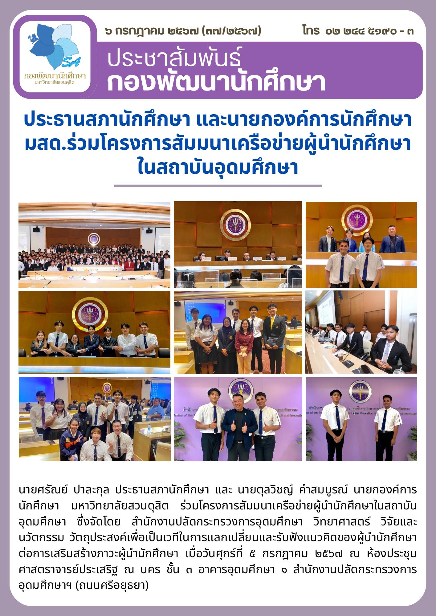 นายศรัณย์ ปาละกุล ประธานสภานักศึกษา และ นายตุลวิชญ์ คำสมบูรณ์ นายกองค์การนักศึกษา มหาวิทยาลัยสวนดุสิต ร่วมโครงการสัมมนาเครือข่ายผู้นำนักศึกษาในสถาบันอุดมศึกษา ซึ่งจัดโดย สำนักงานปลัดกระทรวงการอุดมศึกษา วิทยาศาสตร์ วิจัยและนวัตกรรม วัตถุประสงค์เพื่อเป็นเวทีในการแลกเปลี่ยนและรับฟังแนวคิดของผู้นำนักศึกษาต่อการเสริมสร้างภาวะผู้นำนักศึกษา เมื่อวันศุกร์ที่ ๕ กรกฎาคม ๒๕๖๗ ณ ห้องประชุมศาสตราจารย์ประเสริฐ ณ นคร ชั้น ๓ อาคารอุดมศึกษา ๑ สำนักงานปลัดกระทรวงการ อุดมศึกษาฯ (ถนนศรีอยุธยา)