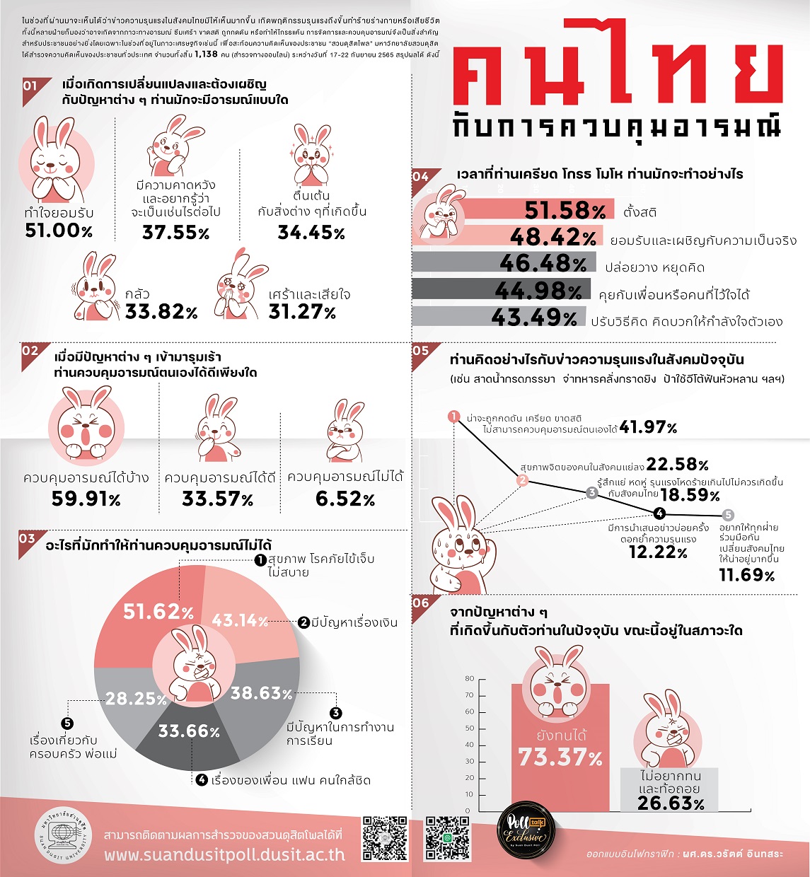 จากสถานการณ์ความรุนแรงที่เพิ่มขึ้นในสังคมไทย สะท้อนให้เห็นถึงปัญหาด้านอารมณ์และสุขภาพจิตของประชาชน งานวิจัยนี้ได้สำรวจความคิดเห็นของประชาชนจำนวน 1,138 คน ระหว่างวันที่ 17–22 กันยายน 2565 พบว่า เมื่อเผชิญปัญหา คนส่วนใหญ่มัก "ทำใจยอมรับ" และ "พยายามควบคุมอารมณ์" โดยเฉพาะในช่วงที่เศรษฐกิจและสังคมมีความผันผวน อย่างไรก็ตาม ปัญหาสุขภาพกายและการเงินถูกระบุว่าเป็นปัจจัยหลักที่ส่งผลให้ควบคุมอารมณ์ไม่ได้ นอกจากนี้ประชาชนเลือกวิธีจัดการอารมณ์ด้วยการตั้งสติ เผชิญความจริง และปรับความคิดในทางบวก ขณะเดียวกัน กลุ่มสนทนาให้ข้อมูลเสริมว่าทักษะชีวิต เช่น ความฉลาดทางอารมณ์ (EQ), การรับมือกับปัญหา (AQ), ความสามารถในการฟื้นตัว (RQ) และการเจริญสติ (Mindfulness) เป็นเครื่องมือสำคัญในการสร้างภูมิคุ้มกันทางใจเพื่อรับมือกับความเครียดและวิกฤติ การดูแลสุขภาพจิตจึงเป็นสิ่งที่ควรได้รับการส่งเสริมควบคู่ไปกับการพัฒนาองค์ความรู้และทักษะทางอารมณ์ในทุกช่วงวัย
