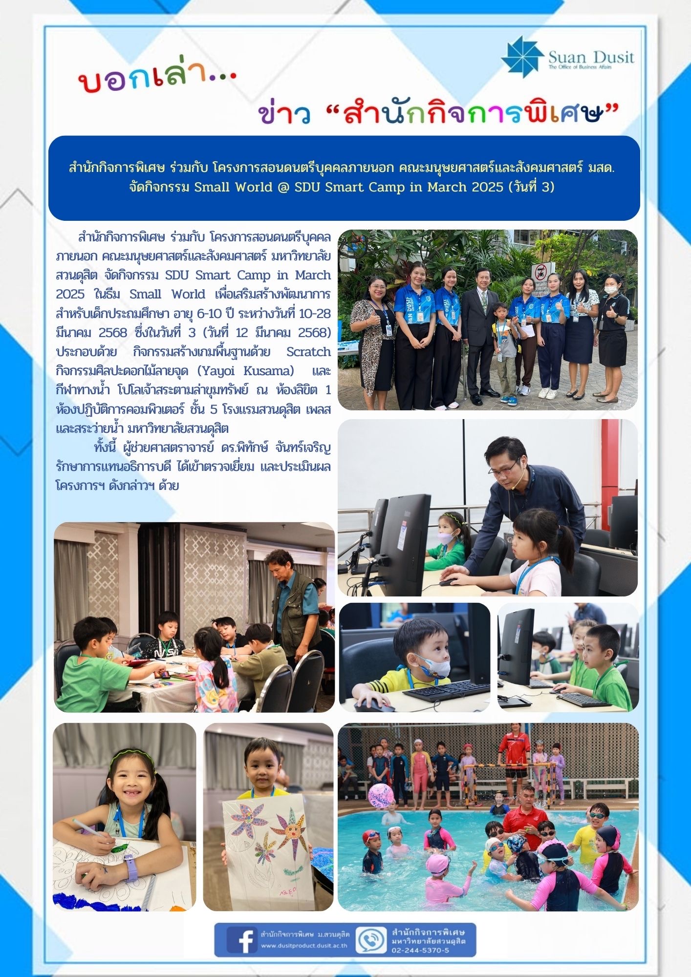 | dc.description | สำนักกิจการพิเศษ ร่วมกับ โครงการสอนดนตรีบุคคลภายนอก คณะมนุษยศาสตร์และสังคมศาสตร์ มหาวิทยาลัยสวนดุสิต จัดกิจกรรม SDU Smart Camp in March 2025 ในธีม Small World เพื่อเสริมสร้างพัฒนาการสำหรับเด็กประถมศึกษา อายุ 6-10 ปี โดยนำองค์ความรู้ด้านกีฬาสำหรับเด็ก การทำอาหาร ศิลปะ วิทยาศาสตร์ ภาษาอังกฤษ วัฒนธรรมจีน และความรู้ทาง IT มาบูรณาการร่วมกัน ระหว่างวันที่ 10-28 มีนาคม 2568 ซึ่งในวันที่ 3 (วันที่ 12 มีนาคม 2568) ประกอบด้วย กิจกรรม IT สร้างเกมพื้นฐานด้วย Scratch โดยคณะครุศาสตร์ กิจกรรมศิลปะ ดอกไม้ลายจุด (Yayoi Kusama) โดย โครงการสอนดนตรีบุคคลภายนอก และกิจกรรมกีฬาทางน้ำ โปโลเจ้าสระตามล่าขุมทรัพย์ โดย โครงการศูนย์บริหารกายเพื่อสุขภาพ สำนักกิจการพิเศษ ณ ห้องลิขิต 1 ห้องปฏิบัติการคอมพิวเตอร์ ชั้น 5 โรงแรมสวนดุสิต เพลส และสระว่ายน้ำ มหาวิทยาลัยสวนดุสิต ทั้งนี้ ผศ.ดร.พิทักษ์ จันทร์เจริญ รักษาการแทนอธิการบดี ได้เข้าตรวจเยี่ยม และประเมินผลโครงการฯ ดังกล่าวฯ ด้วย | |