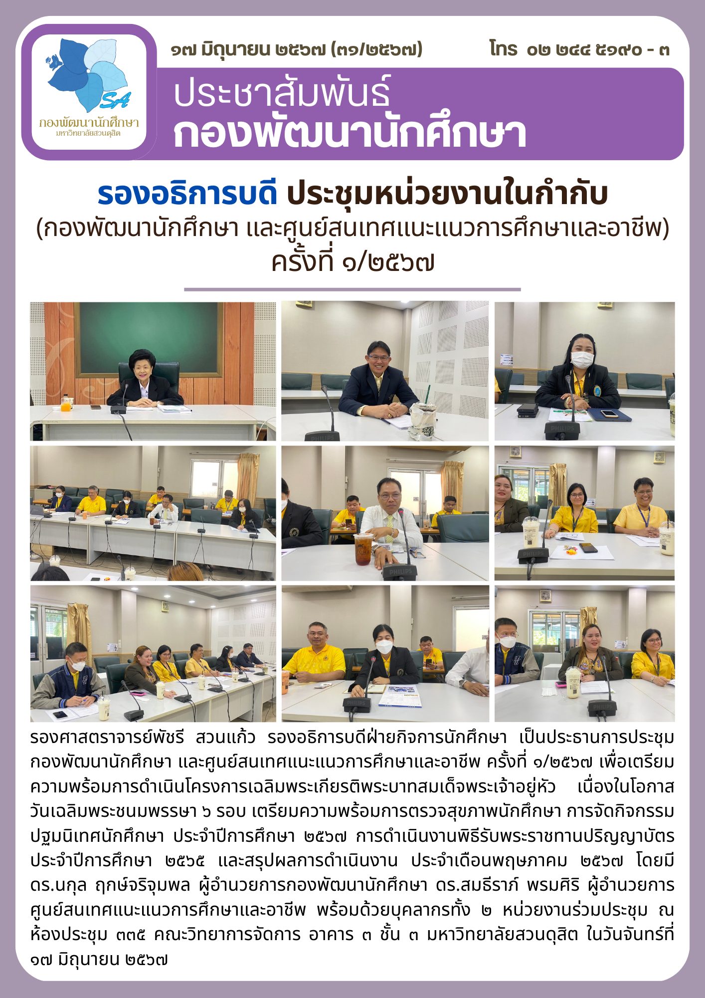 รองศาสตราจารย์พัชรี สวนแก้ว รองอธิการบดีฝ่ายกิจการนักศึกษา เป็นประธานการประชุมกองพัฒนานักศึกษา และศูนย์สนเทศแนะแนวการศึกษาและอาชีพ ครั้งที่ ๑/๒๕๖๗ เพื่อเตรียมความพร้อมการดำเนินโครงการเฉลิมพระเกียรติพระบาทสมเด็จพระเจ้าอยู่หัว เนื่องในโอกาส วันเฉลิมพระชนมพรรษา ๖ รอบ เตรียมความพร้อมการตรวจสุขภาพนักศึกษา การจัดกิจกรรมปฐมนิเทศนักศึกษา ประจำปีการศึกษา ๒๕๖๗ การดำเนินงานพิธีรับพระราชทานปริญญาบัตร ประจำปีการศึกษา ๒๕๖๕ และสรุปผลการดำเนินงาน ประจำเดือนพฤษภาคม ๒๕๖๗ โดยมี ดร.นกุล ฤกษ์จริจุมพล ผู้อำนวยการกองพัฒนานักศึกษา ดร.สมธีราภ์ พรมศิริ ผู้อำนวยการศูนย์สนเทศแนะแนวการศึกษาและอาชีพ พร้อมด้วยบุคลากรทั้ง ๒ หน่วยงานร่วมประชุม ณ ห้องประชุม ๓๓๕ คณะวิทยาการจัดการ อาคาร ๓ ชั้น ๓ มหาวิทยาลัยสวนดุสิต ในวันจันทร์ที่ ๑๗ มิถุนายน ๒๕๖๗