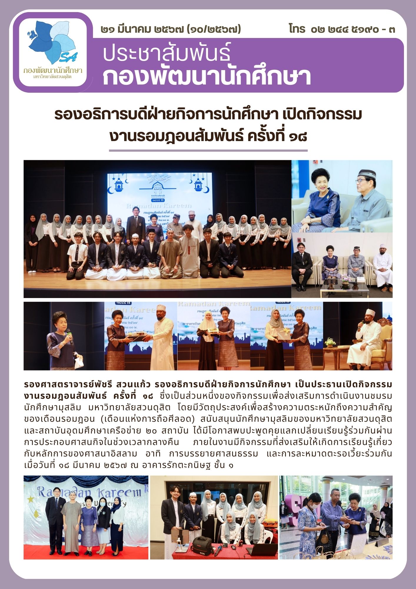 รองศาสตราจารย์พัชรี สวนแก้ว รองอธิการบดีฝ่ายกิจการนักศึกษา เป็นประธานเปิดกิจกรรมงานรอมฎอนสัมพันธ์ ครั้งที่ ๑๘ ซึ่งเป็นส่วนหนึ่งของกิจกรรมเพื่อส่งเสริมการดำเนินงานชมรมนักศึกษามุสลิม มหาวิทยาลัยสวนดุสิต โดยมีวัตถุประสงค์เพื่อสร้างความตระหนักถึงความสำคัญของเดือนรอมฎอน (เดือนแห่งการถือศีลอด) สนับสนุนนักศึกษามุสลิมของมหาวิทยาลัยสวนดุสิตและสถาบันอุดมศึกษาเครือข่าย ๒๐ สถาบัน ได้มีโอกาสพบปะพูดคุยแลกเปลี่ยนเรียนรู้ร่วมกันผ่านการประกอบศาสนกิจในช่วงเวลากลางคืน ภายในงานมีกิจกรรมที่ส่งเสริมให้เกิดการเรียนรู้เกี่ยวกับหลักการของศาสนาอิสลาม อาทิ การบรรยายศาสนธรรม และการละหมาดตะรอเวี้ยะร่วมกัน เมื่อวันที่ ๑๘ มีนาคม ๒๕๖๗ ณ อาคารรักตะกนิษฐ ชั้น ๑