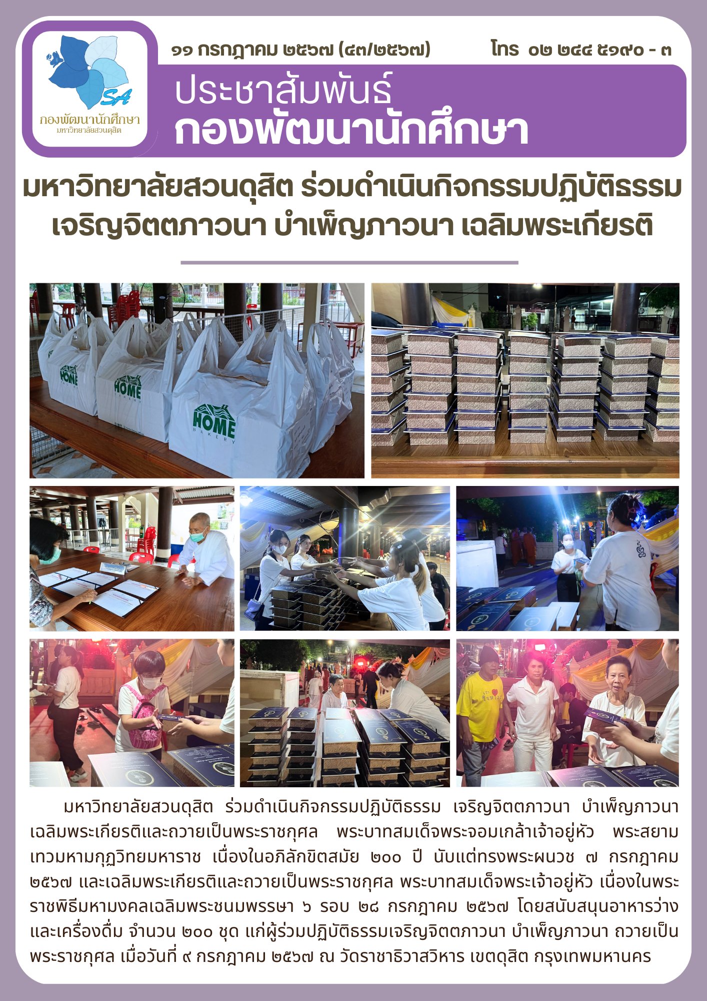 มหาวิทยาลัยสวนดุสิต ร่วมดำเนินกิจกรรมปฏิบัติธรรม เจริญจิตตภาวนา บำเพ็ญภาวนา เฉลิมพระเกียรติและถวายเป็นพระราชกุศล พระบาทสมเด็จพระจอมเกล้าเจ้าอยู่หัว พระสยามเทวมหามกุฏวิทยมหาราช เนื่องในอภิลักขิตสมัย ๒๐๐ ปี นับแต่ทรงพระผนวช ๗ กรกฎาคม ๒๕๖๗ และเฉลิมพระเกียรติและถวายเป็นพระราชกุศล พระบาทสมเด็จพระเจ้าอยู่หัว เนื่องในพระราชพิธีมหามงคลเฉลิมพระชนมพรรษา ๖ รอบ ๒๘ กรกฎาคม ๒๕๖๗ โดยสนับสนุนอาหารว่างและเครื่องดื่ม จำนวน ๒๐๐ ชุด แก่ผู้ร่วมปฏิบัติธรรมเจริญจิตตภาวนา บำเพ็ญภาวนา ถวายเป็นพระราชกุศล เมื่อวันที่ ๙ กรกฎาคม ๒๕๖๗ ณ วัดราชาธิวาสวิหาร เขตดุสิต กรุงเทพมหานคร