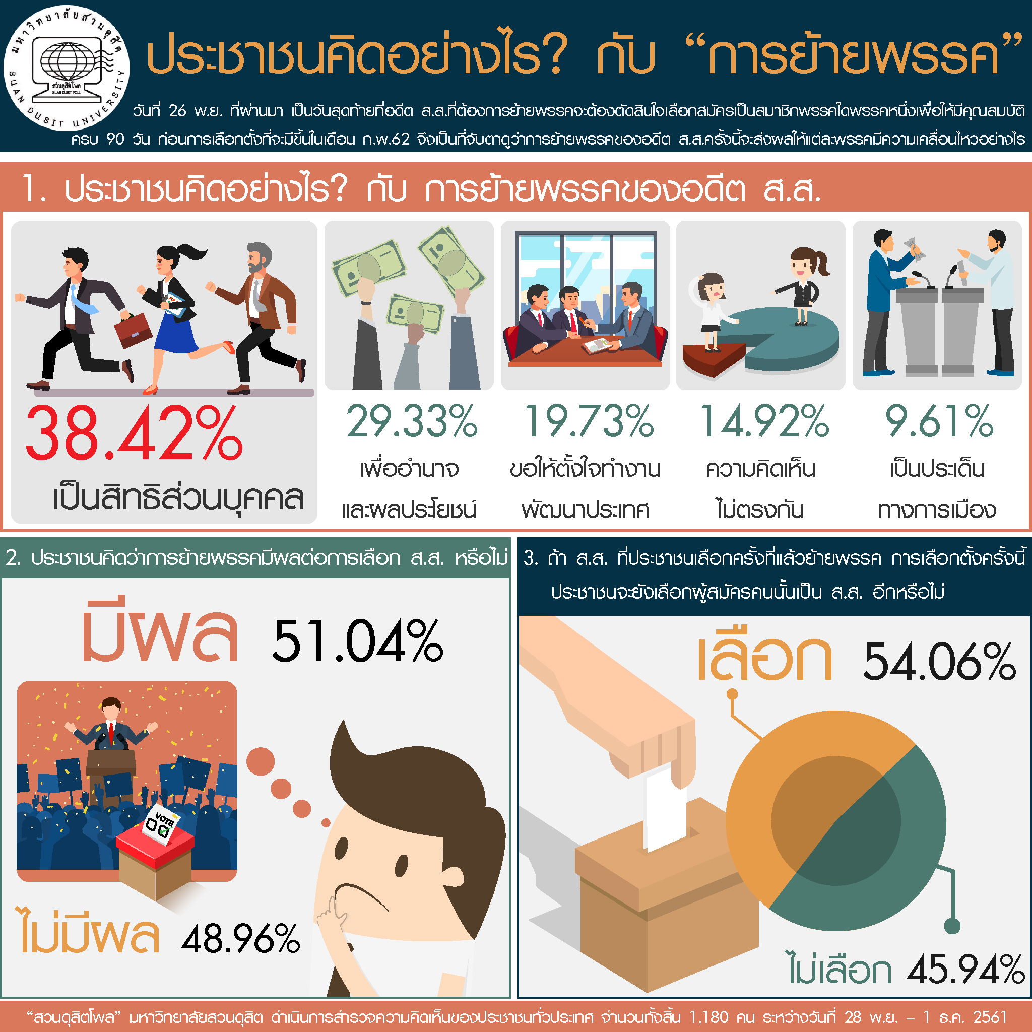 เมื่อวันที่ 26 พฤศจิกายน เป็นวันสุดท้ายที่อดีต ส.ส. ต้องตัดสินใจย้ายพรรคเพื่อให้มีคุณสมบัติครบ 90 วันก่อนการเลือกตั้งในเดือนกุมภาพันธ์ 2562 “สวนดุสิตโพล” ได้สำรวจความคิดเห็นของประชาชน 1,180 คน ระหว่างวันที่ 28 พฤศจิกายน – 1 ธันวาคม 2561 เพื่อสะท้อนมุมมองต่อการย้ายพรรคของอดีต ส.ส. ผลสำรวจพบว่า ประชาชนส่วนใหญ่ (38.42%) มองว่าการย้ายพรรคเป็นสิทธิส่วนบุคคลตามระบอบประชาธิปไตย ขณะที่อีก 29.33% เชื่อว่ามีเบื้องหลังเรื่องผลประโยชน์และอำนาจ การย้ายพรรคยังถูกมองว่าอาจมีเหตุจากปัญหาภายในพรรคหรือความเห็นไม่ตรงกัน ในด้านผลกระทบต่อการเลือกตั้ง ประชาชนกว่า 51.04% เห็นว่ามีผล เพราะกระทบความเชื่อมั่นและนโยบายของพรรค แต่ก็มี 48.96% ที่มองว่าไม่มีผล เพราะพิจารณาจากตัวบุคคลเป็นหลัก เมื่อถามว่าจะยังเลือกผู้สมัครเดิมที่ย้ายพรรคหรือไม่ ร้อยละ 54.06 ตอบว่ายังเลือก หากเขามีผลงานดีและทำเพื่อประชาชนอย่างแท้จริง