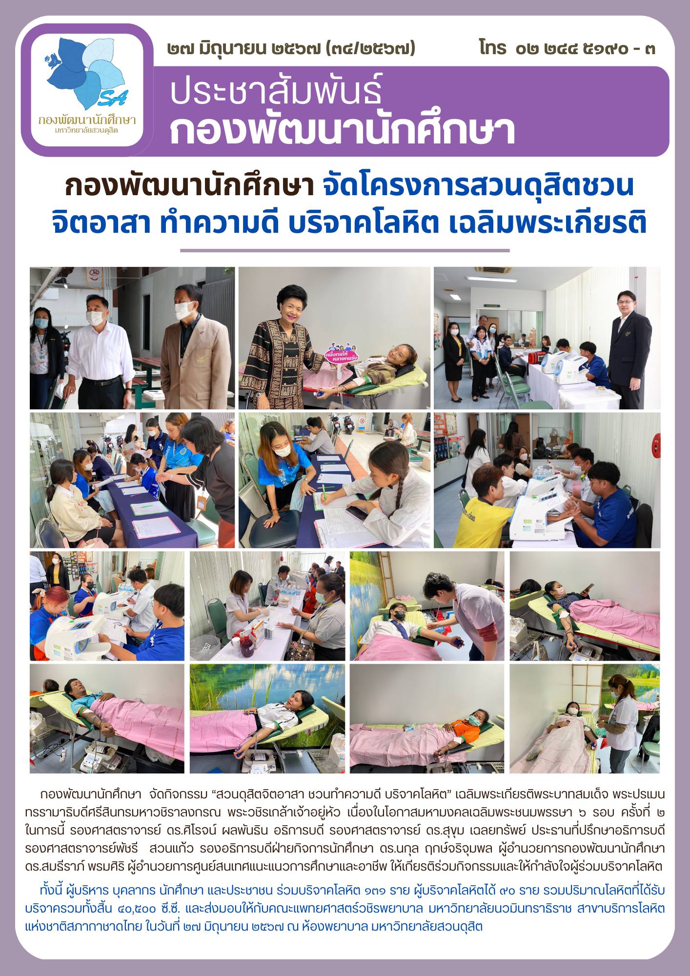 กองพัฒนานักศึกษา จัดกิจกรรม “สวนดุสิตจิตอาสา ชวนทำความดี บริจาคโลหิต” เฉลิมพระเกียรติพระบาทสมเด็จ พระปรเมนทรรามาธิบดีศรีสินทรมหาวชิราลงกรณ พระวชิรเกล้าเจ้าอยู่หัว เนื่องในโอกาสมหามงคลเฉลิมพระชนมพรรษา ๖ รอบ ครั้งที่ ๒ ในการนี้ รองศาสตราจารย์ ดร.ศิโรจน์ ผลพันธิน อธิการบดี รองศาสตราจารย์ ดร.สุขุม เฉลยทรัพย์ ประธานที่ปรึกษาอธิการบดี รองศาสตราจารย์พัชรี สวนแก้ว รองอธิการบดีฝ่ายกิจการนักศึกษา ดร.นกุล ฤกษ์จริจุมพล ผู้อำนวยการกองพัฒนานักศึกษา ดร.สมธีราภ์ พรมศิริ ผู้อำนวยการศูนย์สนเทศแนะแนวการศึกษาและอาชีพ ให้เกียรติร่วมกิจกรรมและให้กำลังใจผู้ร่วมบริจาคโลหิต ทั้งนี้ ผู้บริหาร บุคลากร นักศึกษา และประชาชน ร่วมบริจาคโลหิต ๑๓๑ ราย ผู้บริจาคโลหิตได้ ๙๐ ราย รวมปริมาณโลหิตที่ได้รับบริจาครวมทั้งสิ้น ๔๐,๕๐๐ ซี.ซี. และส่งมอบให้กับคณะแพทยศาสตร์วชิรพยาบาล มหาวิทยาลัยนวมินทราธิราช สาขาบริการโลหิตแห่งชาติสภากาชาดไทย ในวันที่ ๒๗ มิถุนายน ๒๕๖๗ ณ ห้องพยาบาล มหาวิทยาลัยสวนดุสิต