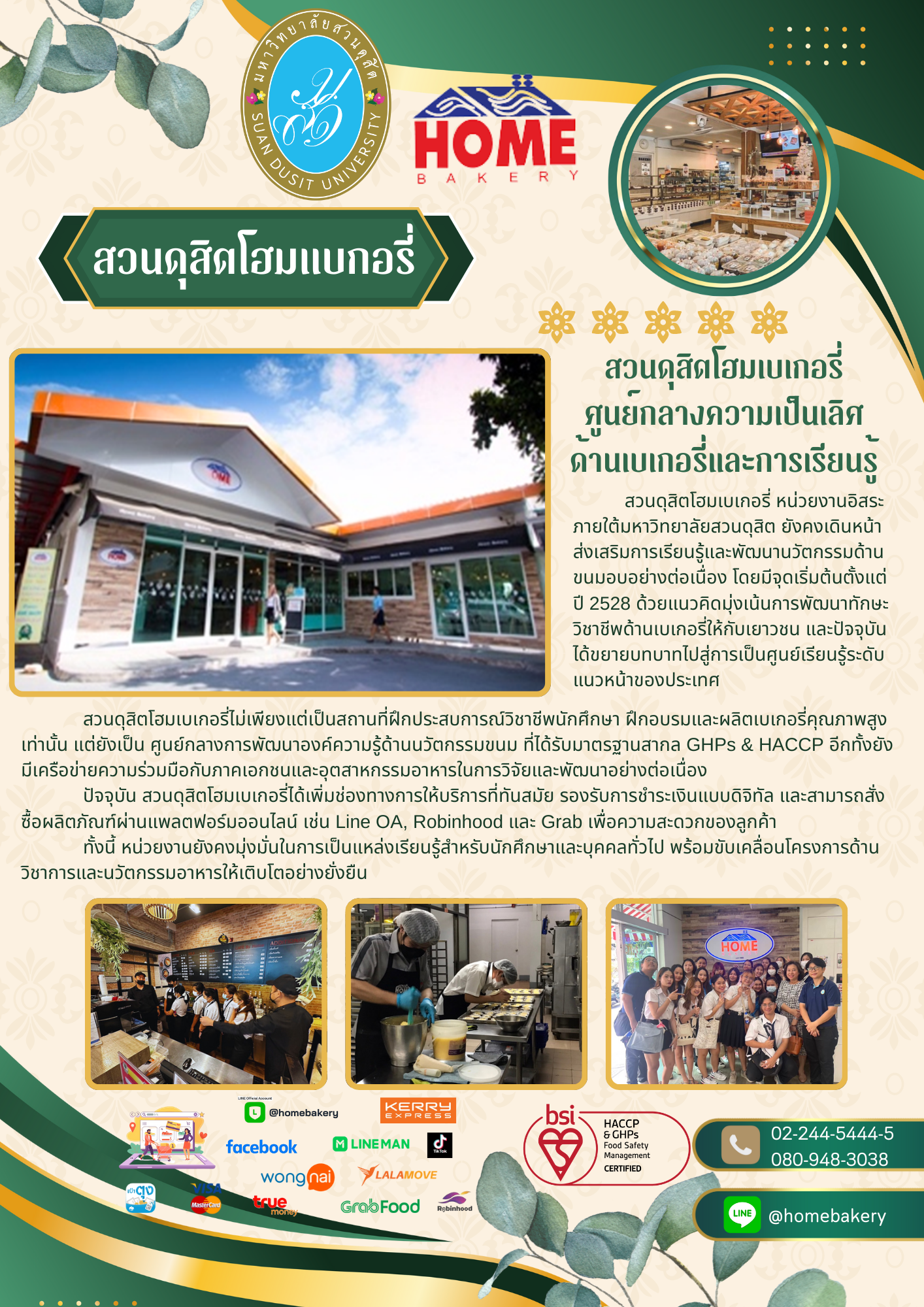 สวนดุสิตโฮมเบเกอรี่ หน่วยงานอิสระภายใต้มหาวิทยาลัยสวนดุสิต ยังคงเดินหน้าส่งเสริมการเรียนรู้และพัฒนานวัตกรรมด้านขนมอบอย่างต่อเนื่อง โดยมีจุดเริ่มต้นตั้งแต่ปี 2528 ด้วยแนวคิดมุ่งเน้นการพัฒนาทักษะวิชาชีพด้านเบเกอรี่ให้กับเยาวชน และปัจจุบันได้ขยายบทบาทไปสู่การเป็นศูนย์เรียนรู้ระดับแนวหน้าของประเทศ สวนดุสิตโฮมเบเกอรี่ไม่เพียงแต่เป็นสถานที่ฝึกประสบการณ์วิชาชีพนักศึกษา ฝึกอบรมและผลิตเบเกอรี่คุณภาพสูงเท่านั้น แต่ยังเป็น ศูนย์กลางการพัฒนาองค์ความรู้ด้านนวัตกรรมขนม ที่ได้รับมาตรฐานสากล GHPs & HACCP อีกทั้งยังมีเครือข่ายความร่วมมือกับภาคเอกชนและอุตสาหกรรมอาหารในการวิจัยและพัฒนาอย่างต่อเนื่อง ปัจจุบัน สวนดุสิตโฮมเบเกอรี่ได้เพิ่มช่องทางการให้บริการที่ทันสมัย รองรับการชำระเงินแบบดิจิทัล และสามารถสั่งซื้อผลิตภัณฑ์ผ่านแพลตฟอร์มออนไลน์ เช่น Line OA, Robinhood และ Grab เพื่อความสะดวกของลูกค้า ทั้งนี้ หน่วยงานยังคงมุ่งมั่นในการเป็นแหล่งเรียนรู้สำหรับนักศึกษาและบุคคลทั่วไป พร้อมขับเคลื่อนโครงการด้านวิชาการและนวัตกรรมอาหารให้เติบโตอย่างยั่งยืน