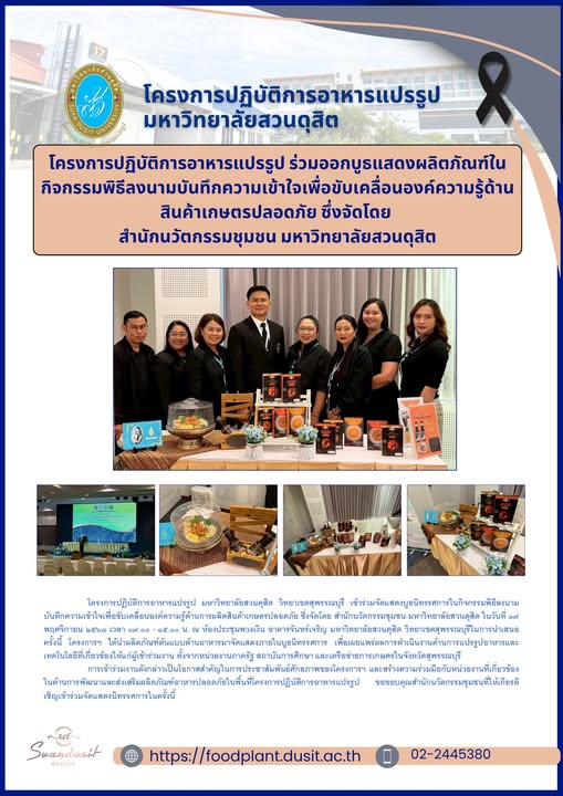 โครงการปฏิบัติการอาหารแปรรูป มหาวิทยาลัยสวนดุสิต วิทยาเขตสุพรรณบุรี เข้าร่วมจัดแสดงบูธนิทรรศการในกิจกรรมพิธีลงนามบันทึกความเข้าใจเพื่อขับเคลื่อนองค์ความรู้ด้านการผลิตสินค้าเกษตรปลอดภัย ซึ่งจัดโดย สำนักนวัตกรรมชุมชน มหาวิทยาลัยสวนดุสิต ในวันที่ ๑๙ พฤศจิกายน ๒๕๖๘ เวลา ๐๙.๐๐ - ๑๕.๐๐ น. ณ ห้องประชุมพวงเงิน อาคารจันทร์เจริญ มหาวิทยาลัยสวนดุสิต วิทยาเขตสุพรรณบุรีในการนำเสนอครั้งนี้ โครงการฯ ได้นำผลิตภัณฑ์ต้นแบบด้านอาหารมาจัดแสดงภายในบูธนิทรรศการ เพื่อเผยแพร่ผลการดำเนินงานด้านการแปรรูปอาหารและเทคโนโลยีที่เกี่ยวข้องให้แก่ผู้เข้าร่วมงาน ทั้งจากหน่วยงานภาครัฐ สถาบันการศึกษา และเครือข่ายการเกษตรในจังหวัดสุพรรณบุรี