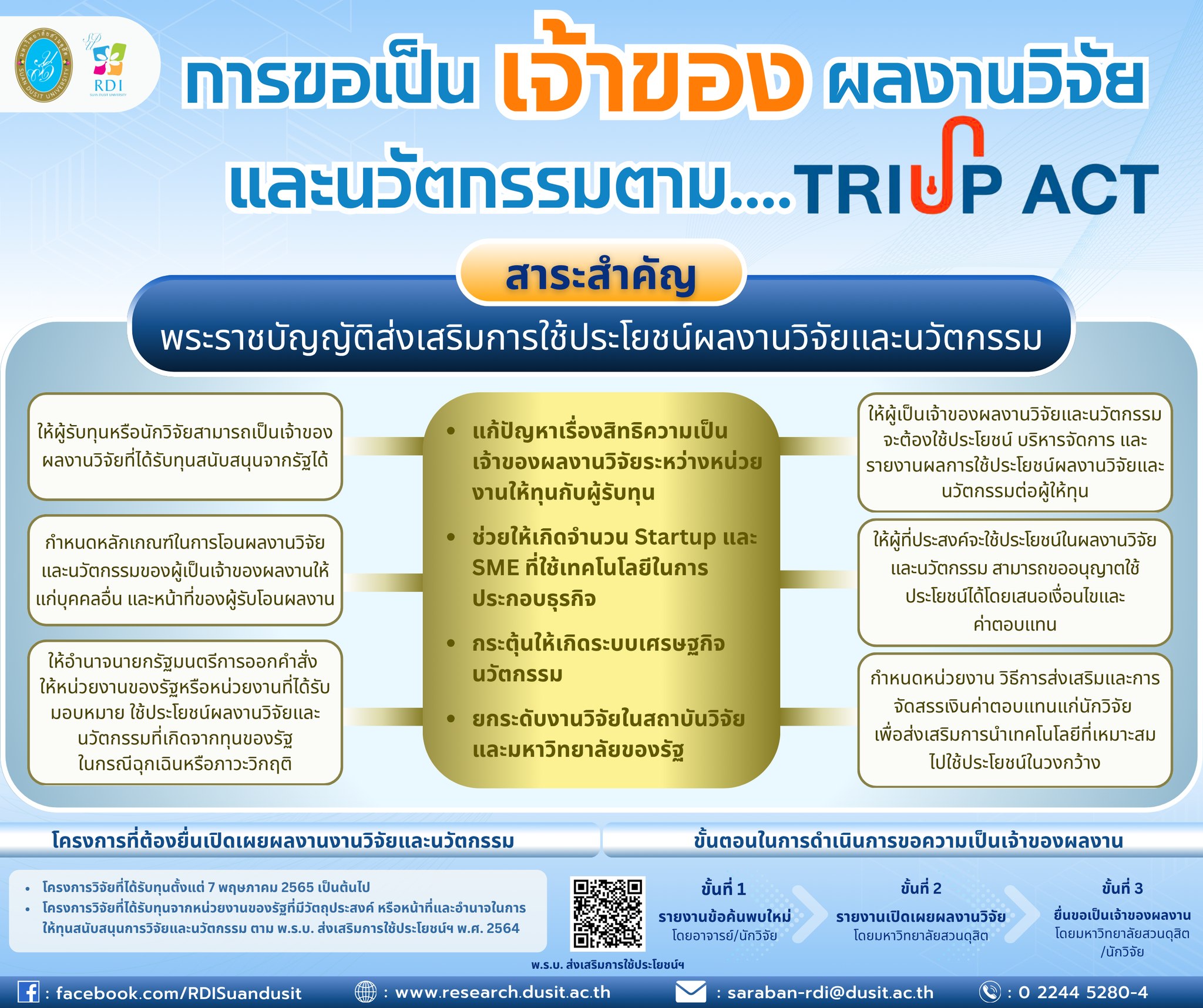 สถาบันวิจัยและพัฒนา มหาวิทยาลัยสวนดุสิต ขอเชิญคณาจารย์ นักวิจัย ที่ได้รับทุนสนับสนุนงานเชิงกลยุทธ์ (Strategic Fund; SF) เช่น วช. สวก. บพค. บพท. ฯลฯ สมัครใช้งานระบบสารสนเทศรองรับพระราชบัญญัติส่งเสริมการใช้ประโยชน์ผลงานวิจัยและนวัตกรรม พ.ศ. 2564 เพื่อการขอเป็นเจ้าของผลงานสู่การนำงานวิจัยและนวัตกรรมไปใช้ประโยชน์