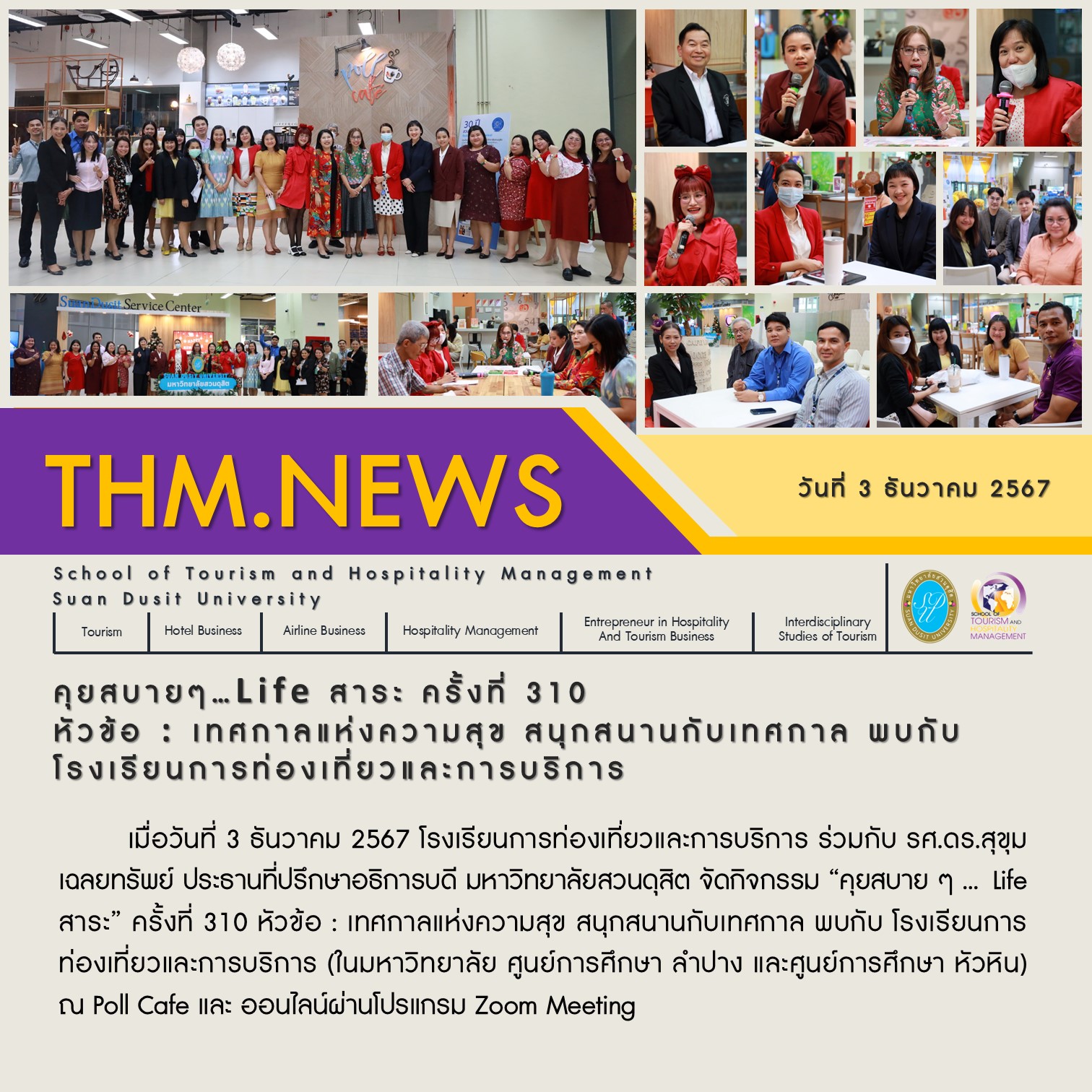 เมื่อวันที่ 3 ธันวาคม 2567 โรงเรียนการท่องเที่ยวและการบริการ ร่วมกับ รศ.ดร.สุขุม เฉลยทรัพย์ ประธานที่ปรึกษาอธิการบดี มหาวิทยาลัยสวนดุสิต จัดกิจกรรม “คุยสบาย ๆ … Life สาระ” ครั้งที่ 310 หัวข้อ : เทศกาลแห่งความสุข สนุกสนานกับเทศกาล พบกับ โรงเรียนการท่องเที่ยวและการบริการ (ในมหาวิทยาลัย ศูนย์การศึกษา ลำปาง และศูนย์การศึกษา หัวหิน) ณ Poll Cafe และ ออนไลน์ผ่านโปรแกรม Zoom Meeting