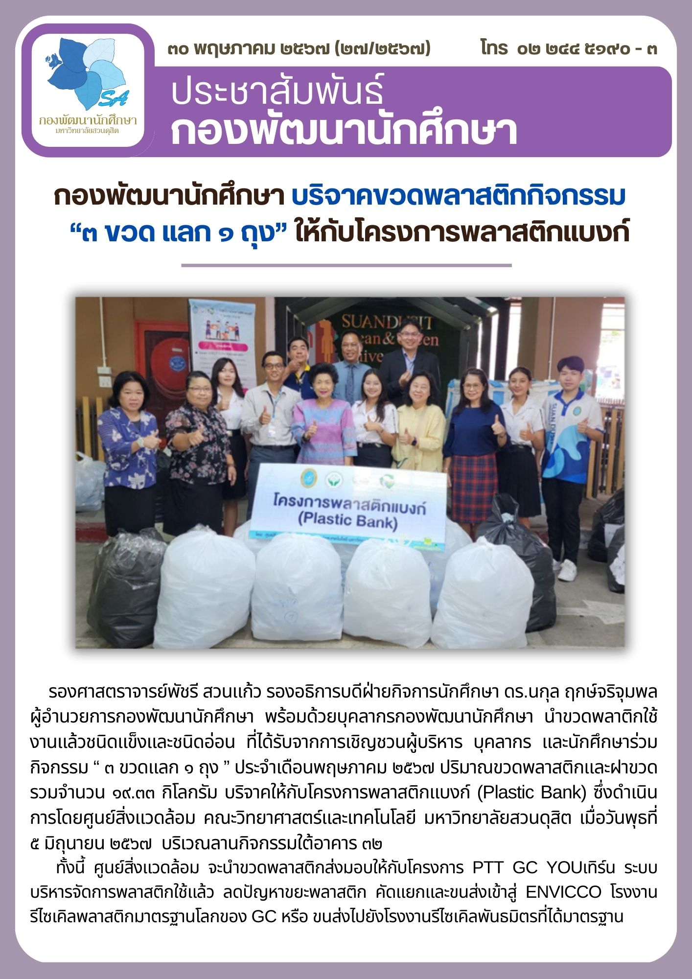 รองศาสตราจารย์พัชรี สวนแก้ว รองอธิการบดีฝ่ายกิจการนักศึกษา ดร.นกุล ฤกษ์จริจุมพล ผู้อำนวยการกองพัฒนานักศึกษา พร้อมด้วยบุคลากรกองพัฒนานักศึกษา นำขวดพลาติกใช้งานแล้วชนิดแข็งและชนิดอ่อน ที่ได้รับจากการเชิญชวนผู้บริหาร บุคลากร และนักศึกษาร่วมกิจกรรม “ ๓ ขวดแลก ๑ ถุง ” ประจำเดือนพฤษภาคม ๒๕๖๗ ปริมาณขวดพลาสติกและฝาขวด รวมจำนวน ๑๙.๓๓ กิโลกรัม บริจาคให้กับโครงการพลาสติกแบงก์ (Plastic Bank) ซึ่งดำเนินการโดยศูนย์สิ่งแวดล้อม คณะวิทยาศาสตร์และเทคโนโลยี มหาวิทยาลัยสวนดุสิต เมื่อวันพุธที่ ๕ มิถุนายน ๒๕๖๗ บริเวณลานกิจกรรมใต้อาคาร ๓๒