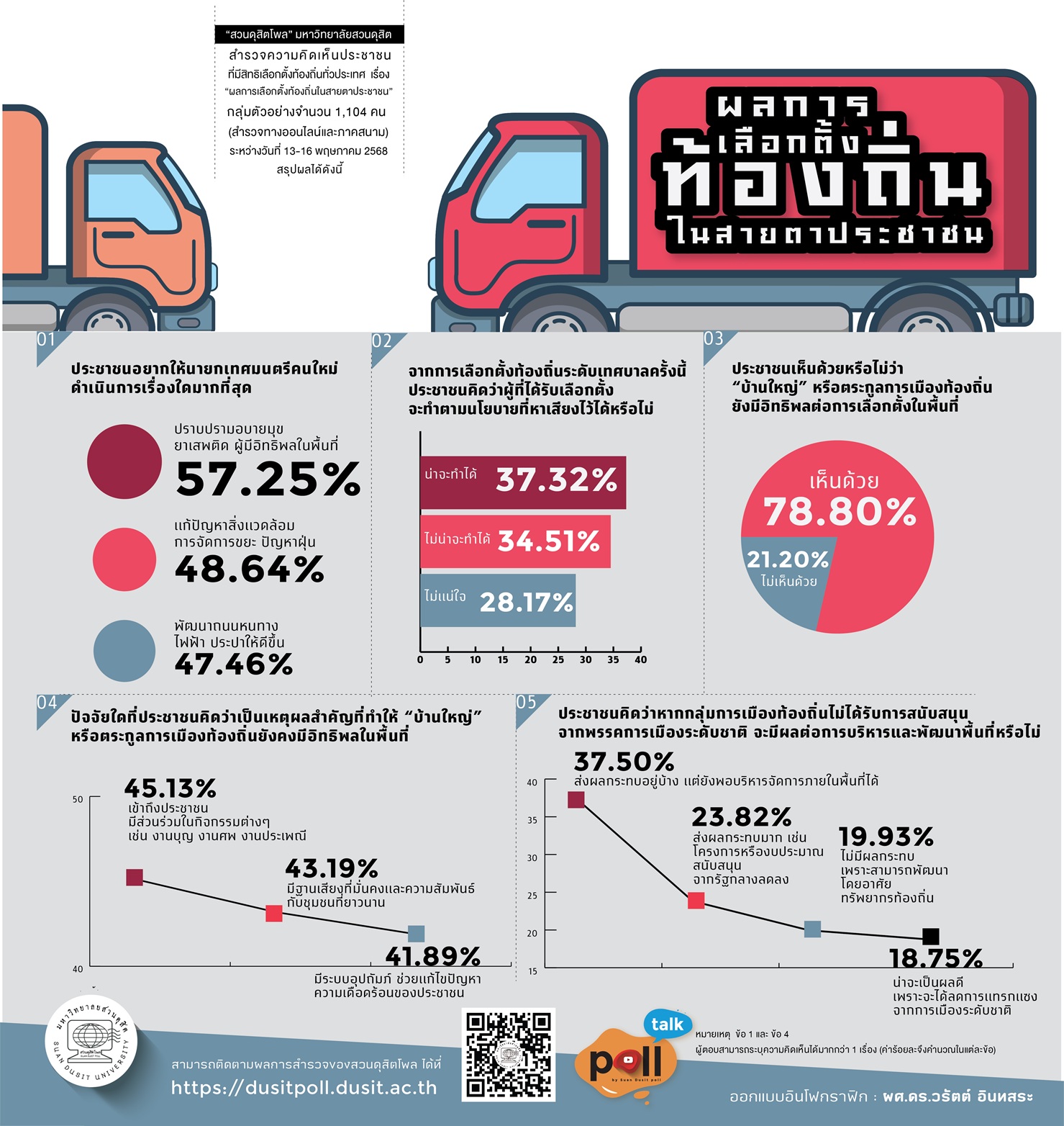 “สวนดุสิตโพล” มหาวิทยาลัยสวนดุสิต สำรวจความคิดเห็นประชาชนที่มีสิทธิเลือกตั้งท้องถิ่นทั่วประเทศ เรื่อง “ผลการเลือกตั้งท้องถิ่นในสายตาประชาชน” พบว่า เรื่องที่อยากให้นายกเทศมนตรีคนใหม่ดำเนินการมากที่สุด คือ ปราบปรามอบายมุข ยาเสพติด ผู้มีอิทธิพลในพื้นที่ 57.25% โดยมองว่าผู้ที่ได้รับเลือกตั้งน่าจะทำได้ตามนโยบายที่หาเสียงไว้ 37.32%