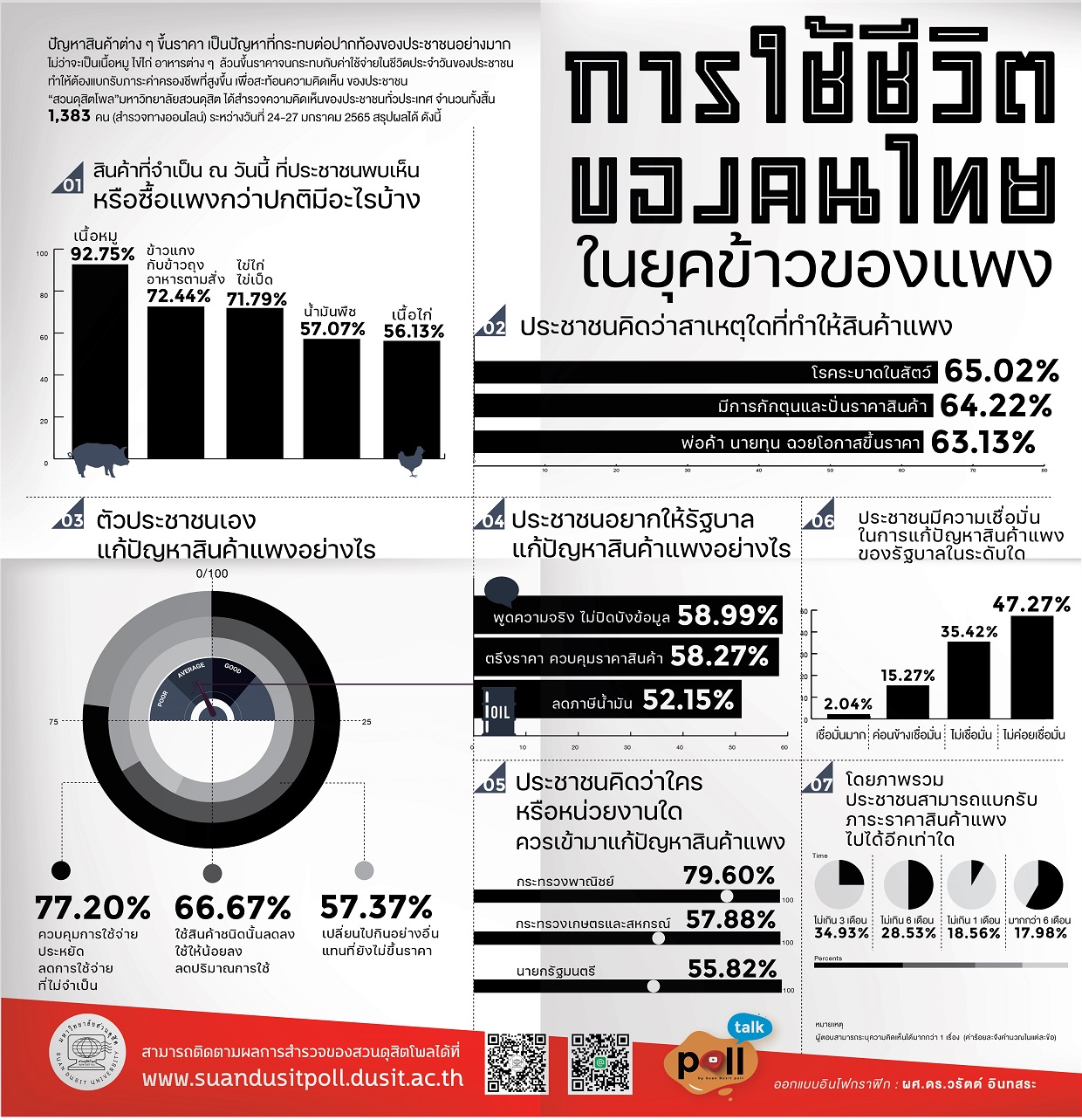 จากการสำรวจความคิดเห็นของประชาชน 1,383 คน พบว่าปัญหาสินค้าราคาแพงส่งผลกระทบต่อชีวิตประจำวันอย่างชัดเจน โดยสินค้าที่ราคาสูงขึ้นมากที่สุด ได้แก่ เนื้อหมู ข้าวแกง ไข่ไก่ และน้ำมันพืช สาเหตุหลักมาจากโรคระบาดในสัตว์ การกักตุนสินค้า และการฉวยโอกาสปรับขึ้นราคาจากพ่อค้า ประชาชนจึงต้องปรับตัวด้วยการประหยัด ลดการใช้จ่าย และเปลี่ยนพฤติกรรมการบริโภค อย่างไรก็ตาม ความเชื่อมั่นต่อการแก้ไขปัญหาของรัฐบาลยังอยู่ในระดับต่ำ โดยประชาชนต้องการให้ภาครัฐเปิดเผยข้อมูลอย่างตรงไปตรงมา และมีมาตรการควบคุมราคาที่ชัดเจน พร้อมทั้งสนับสนุนหน่วยงานหลัก เช่น กระทรวงพาณิชย์ ให้เข้าไปจัดการกับสถานการณ์ ข้อมูลยังชี้ว่า มากกว่าครึ่งของประชาชนไม่สามารถแบกรับภาระค่าครองชีพที่สูงเกิน 3 เดือนได้ โดยเฉพาะกลุ่มรายได้น้อยหรือผู้ว่างงาน