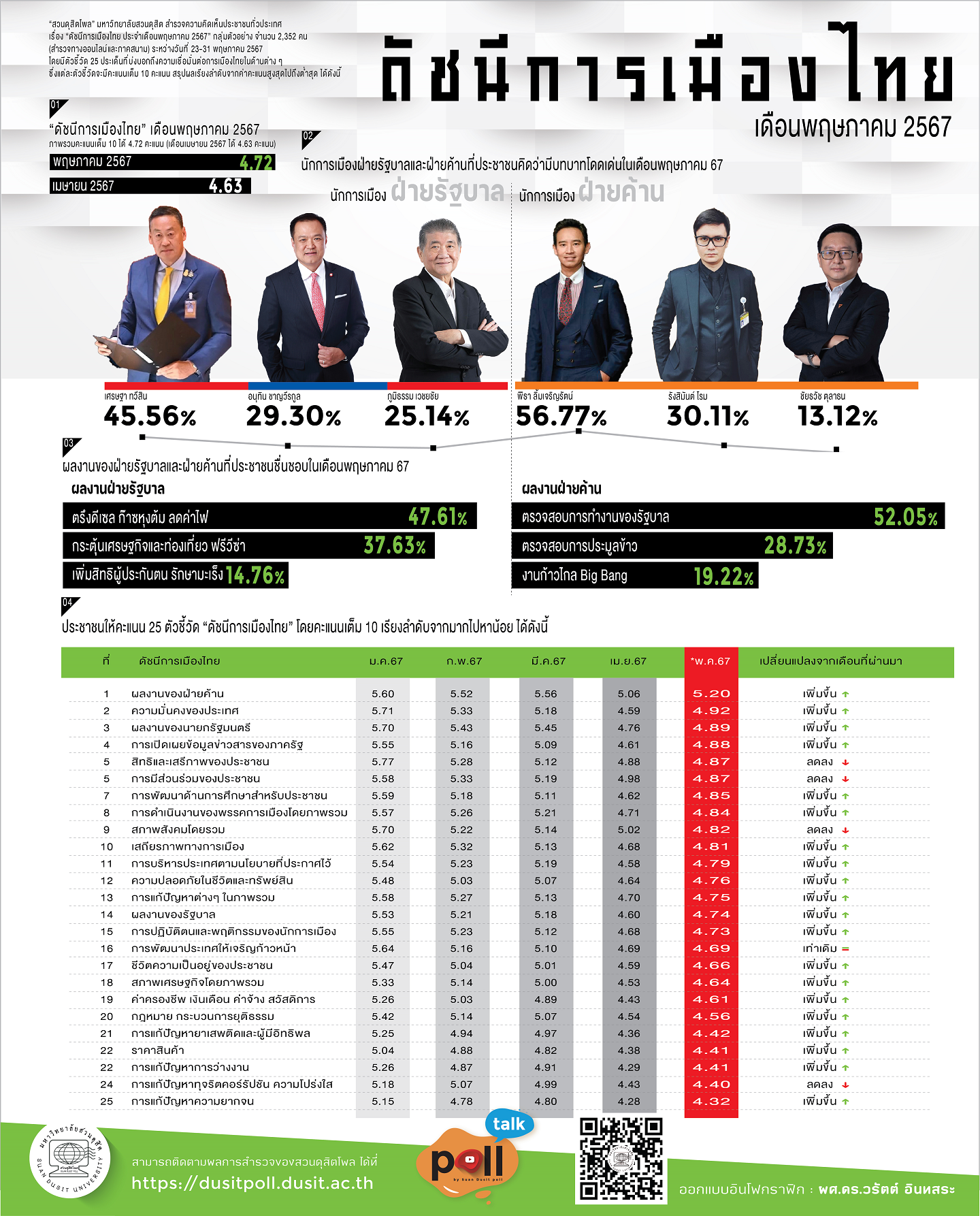 สวนดุสิตโพล มหาวิทยาลัยสวนดุสิต สำรวจความคิดเห็นประชาชนทั่วประเทศ เรื่อง “ดัชนีการเมืองไทย ประจำเดือนพฤษภาคม 2567” กลุ่มตัวอย่าง จำนวน 2,352 คน (สำรวจทางออนไลน์และภาคสนาม) ระหว่างวันที่ 23-31 พฤษภาคม 2567 พบว่า กลุ่มตัวอย่างให้คะแนนภาพรวมดัชนีการเมืองไทยประจำเดือนพฤษภาคม 2567 เฉลี่ย 4.72 คะแนน เพิ่มขึ้นจากเดือนเมษายน 2567 ที่ได้ 4.63 คะแนน ตัวชี้วัดที่ได้คะแนนสูงสุด คือ ผลงานของฝ่ายค้าน เฉลี่ย 5.20 คะแนน (เพิ่มขึ้นจากเดือนเมษายน) ตัวชี้วัดที่ได้คะแนนต่ำสุด คือ การแก้ปัญหาความยากจน เฉลี่ย 4.32 คะแนน (เพิ่มขึ้นจากเดือนเมษายน) นักการเมืองฝ่ายรัฐบาลที่มีบทบาท โดดเด่นประจำเดือน คือ เศรษฐา ทวีสิน ร้อยละ 45.56 ด้านนักการเมืองฝ่ายค้านที่มีบทบาทโดดเด่นประจำเดือน คือ พิธา ลิ้มเจริญรัตน์ ร้อยละ 56.77 ผลงานฝ่ายรัฐบาลที่ชื่นชอบประจำเดือน คือ ตรึงราคาดีเซล ก๊าซหุงต้ม ลดค่าไฟ ร้อยละ 47.61 ผลงานฝ่ายค้านที่ชื่นชอบ คือ ตรวจสอบการทำงานของรัฐบาล ร้อยละ 52.05 นางสาวพรพรรณ บัวทอง นักวิจัยสวนดุสิตโพล ระบุว่า จากผลสำรวจสะท้อนว่าประชาชนมองการทำงานของรัฐบาลและฝ่ายค้านที่ดีขึ้นเมื่อเทียบกับเดือนก่อนหน้า โดยเฉพาะฝ่ายค้านที่มีการทำงานเชิงติดตามตรวจสอบอย่างเข้มข้นตั้งแต่การประมูลข้าว 10 ปี ดิจิทัลวอลเล็ต และงานต่าง ๆ ของรัฐบาล ขณะเดียวกันรัฐบาลก็ได้รับคะแนนเพิ่มขึ้นเล็กน้อย จากการตรึงราคาดีเซลและก๊าซหุงต้ม การลดค่าไฟ กระตุ้นเศรษฐกิจและการท่องเที่ยว และการเพิ่มสิทธิผู้ประกันตน รักษามะเร็ง ก็ถือว่าเป็นผลงานของรัฐบาลที่มองเห็น จับต้องได้ และประชาชนได้ประโยชน์