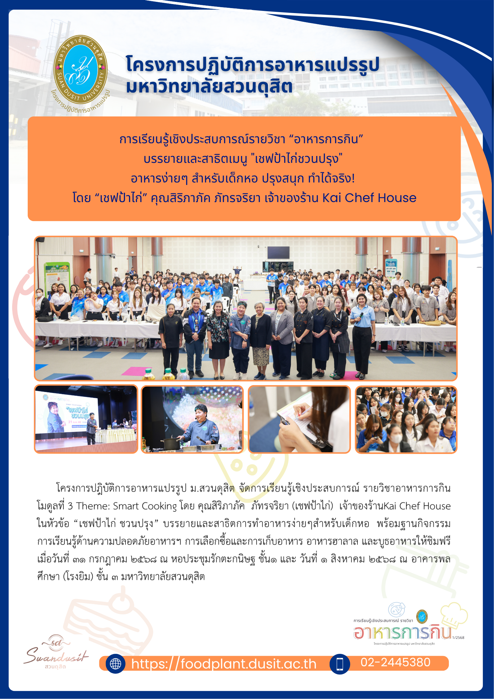 โครงการปฎิบัติการอาหารแปรรูป มหาวิทยาลัยสวนดุสิต จัดการเรียนรู้เชิงประสบการณ์ รายวิชาอาหารการกิน โมดูลที่ 3 Theme: Smart Cooking