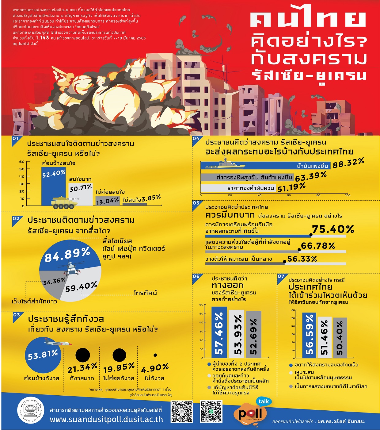 จากสถานการณ์ความขัดแย้งระหว่างรัสเซียและยูเครนที่ส่งผลกระทบในระดับโลก สวนดุสิตโพล มหาวิทยาลัยสวนดุสิต ได้ทำการสำรวจความคิดเห็นของประชาชนไทยจำนวน 1,143 คน ระหว่างวันที่ 7–10 มีนาคม พ.ศ. 2565 เพื่อสะท้อนมุมมองของสังคมไทยต่อเหตุการณ์ดังกล่าว ผลสำรวจพบว่าประชาชนส่วนใหญ่ให้ความสนใจและติดตามข่าวสาร โดยเฉพาะผ่านทางสื่อโซเชียล และมีความกังวลต่อผลกระทบที่อาจเกิดขึ้นกับประเทศไทย เช่น ราคาน้ำมันและค่าครองชีพที่สูงขึ้น ประชาชนเห็นว่าไทยควรเตรียมพร้อมรับมือกับผลกระทบ แสดงความห่วงใยตามหลักมนุษยธรรม และรักษาความเป็นกลางในเวทีโลก สำหรับทางออกของสงคราม ส่วนใหญ่มองว่าผู้นำทั้งสองประเทศควรหันมาเจรจาอย่างสันติ ทั้งนี้ การที่ประเทศไทยร่วมโหวตให้รัสเซียถอนทัพจากยูเครนก็สะท้อนถึงการสนับสนุนหลักมนุษยธรรมและการเคารพกฎหมายระหว่างประเทศ ขณะเดียวกันก็ต้องสร้างสมดุลในความสัมพันธ์ระหว่างประเทศ เพื่อป้องกันไม่ให้เกิดความขัดแย้งในภูมิภาคและเวทีโลก