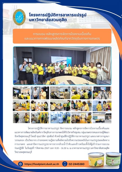 โครงการปฏิบัติการอาหารเเปรรูป จัดการอบรม หลักสูตรการจัดการโรงงานเบื้องต้นและ แนวทางการพัฒนาผลิตภัณฑ์จากวัตถุดิบทางการเกษตรให้กับวิสาหกิจชุมชน กลุ่มเกษตรกรหนองกระทู้พัฒนา จังหวัดสุพรรณบุรี โดยมี คุณปาลิดา สุขพันธ์ หัวหน้าศูนย์ฝึกปฏิบัติการอาหารแปรรูป และนางสาวกาญจนา วรรณทอง เป็นวิทยากร ถ่ายทอดความรู้สถานที่ผลิตรวมไปถึงความปลอดภัยในการแปรรูปผลผลิตทางการเกษตร และสาธิตการแปรรูปอาหารจากกล้วยน้ำว้าดิบและข้าวพร้อมทั้งให้ผู้เข้าร่วมการอบรมร่วมปฏิบัติ ในวันพุธที่ 7 สิงหาคม 2567 เวลา 9.00 - 16.30 น. ณ อาคารอาหารแปรรูป มหาวิทยาลัยสวนดุสิต วิทยาเขตสุพรรณบุรี