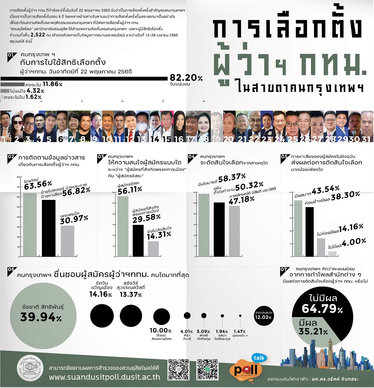 การเลือกตั้งผู้ว่าราชการกรุงเทพมหานครเมื่อวันที่ 22 พฤษภาคม 2565 ถือเป็นการเลือกตั้งในรอบ 9 ปี ซึ่งสวนดุสิตโพลได้ทำการสำรวจความคิดเห็นของประชาชนผู้มีสิทธิเลือกตั้งในกรุงเทพมหานคร จำนวน 2,522 คน ระหว่างวันที่ 12-28 เมษายน 2565 พบว่าร้อยละ 82.20 ตั้งใจจะไปใช้สิทธิเลือกตั้ง โดยประชาชนส่วนใหญ่รับข้อมูลข่าวสารจากโทรทัศน์ และให้ความสนใจผู้สมัครอิสระมากกว่าผู้สมัครที่สังกัดพรรคการเมือง โดยเฉพาะชัชชาติ สิทธิพันธุ์ ที่ได้รับความนิยมสูงสุด การตัดสินใจเลือกตั้งส่วนใหญ่อิงกับนโยบาย ขยันขันแข็ง และภาพลักษณ์ของผู้สมัคร โดยการหาเสียงในปัจจุบันยังมีอิทธิพลต่อการตัดสินใจของประชาชน และผลโพลจากหลายสำนักมีอิทธิพลในระดับหนึ่ง แม้คนส่วนใหญ่จะมองว่าไม่มีผล การเลือกตั้งครั้งนี้ยังสะท้อนความต้องการ “ผู้แก้ปัญหาทุกอย่าง” และส่งผลทางจิตสำนึกของประชาชนต่อการมีส่วนร่วมในระบอบประชาธิปไตยอย่างมีนัยสำคัญ