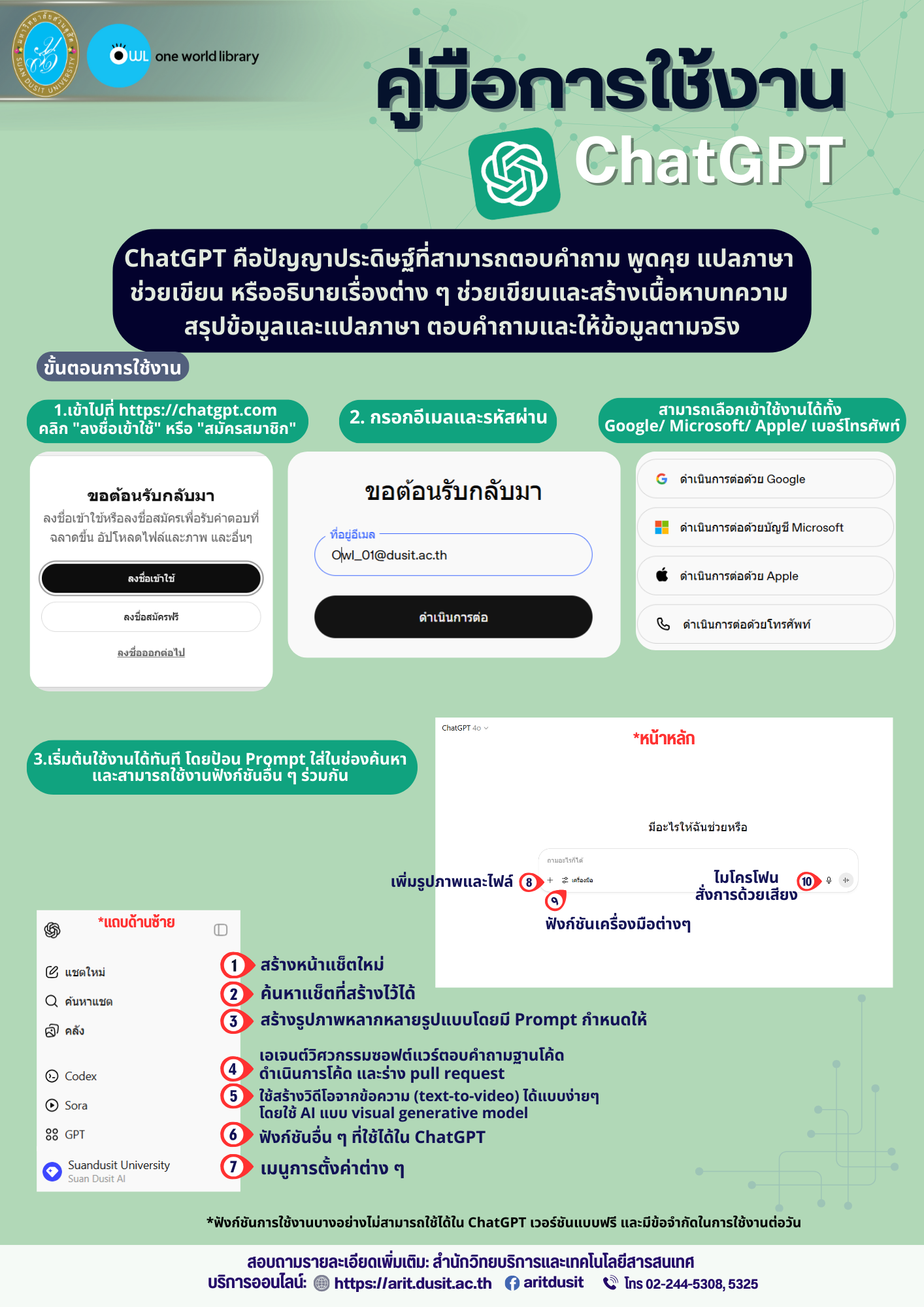 ChatGPT คือ ผู้ช่วยอัจฉริยะ (AI Chatbot) ที่พัฒนาขึ้นโดย OpenAI สามารถโต้ตอบเป็นภาษามนุษย์ ทำงานได้ทั้งการ ตอบคำถาม คิดไอเดีย สรุปเนื้อหา แปลภาษา เขียนโค้ด ออกแบบสื่อ ฯลฯ